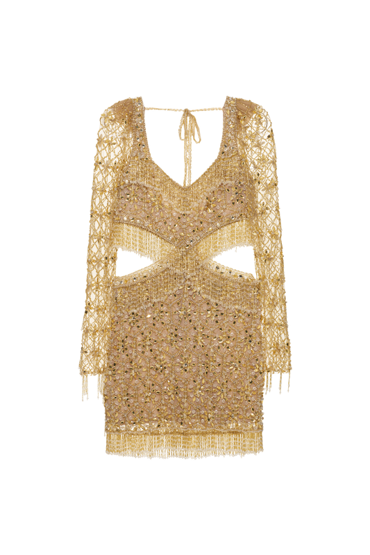 HAND-EMBROIDEREDCRYSTAL EMBROIDERY LONG SLEEVE MINI DRESS