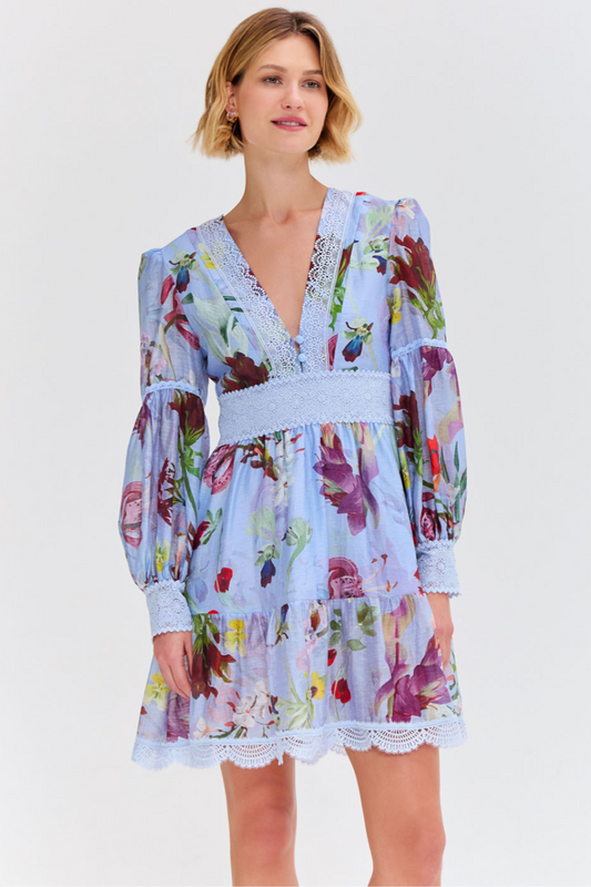 LILY FLOWER LONG SLEEVE PLUNGE MINI DRESS