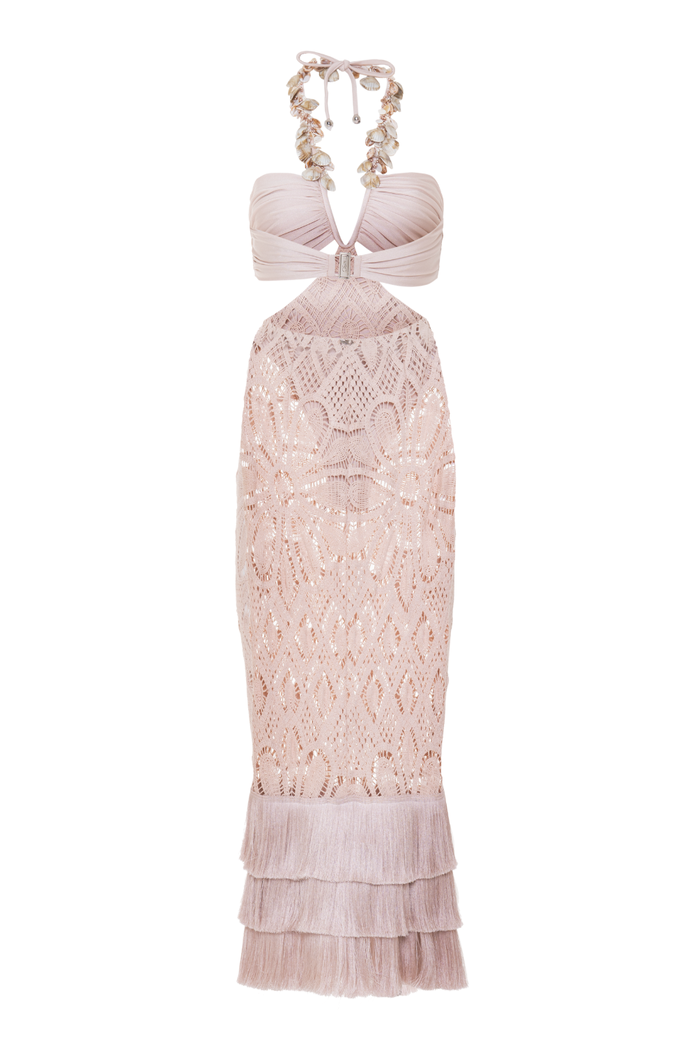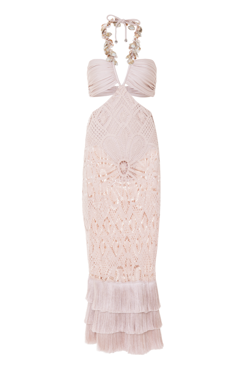 This midi dress features a plunging halter neckline with shell embroidery throughout into a fitted crochet skirt with flattering side cut outs. Built in bodysuit for partial lining and layered fringe trims along the hemline. Open back design with a tie at the neck and clasp at the mid back.