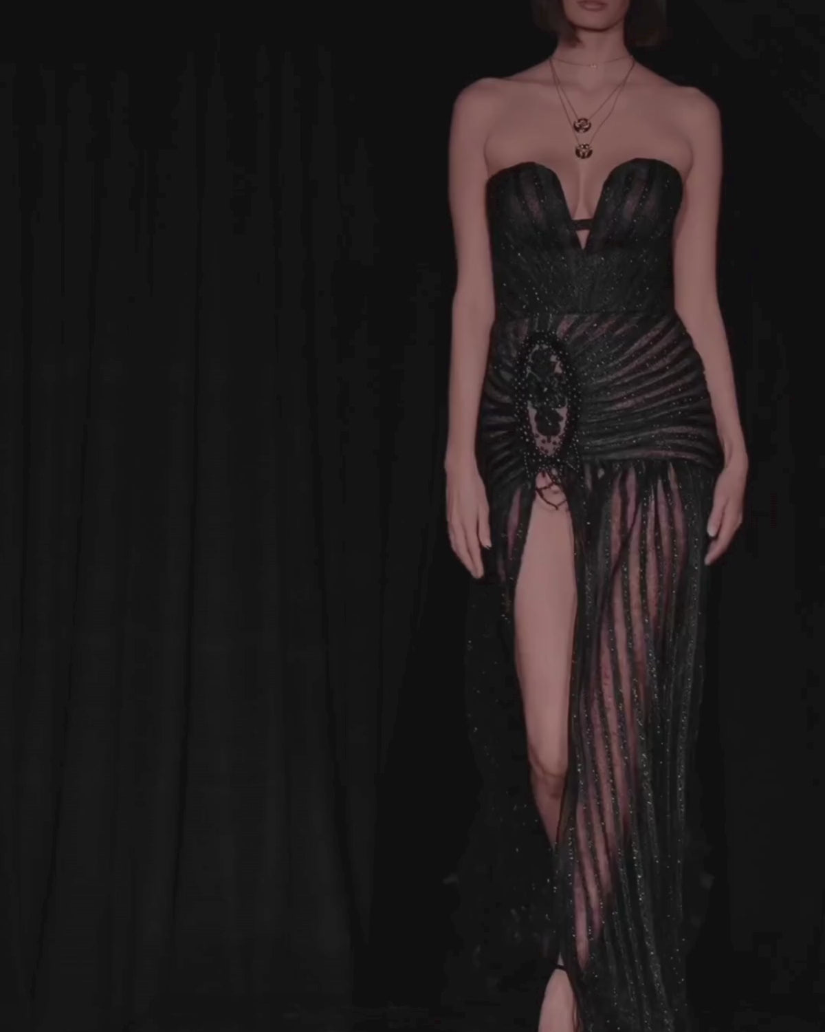 The Gossamer Strapless Maxi Dress was look 18 in the Fall 2024 Runway Collection. Crafted from a striped sparkle tulle fabric, this maxi features a corset bodice with a plunging neckline. The front features an intricate hand-beaded detail using black tonal beads. The dress has a dramatic side slit with a back zipper closure.