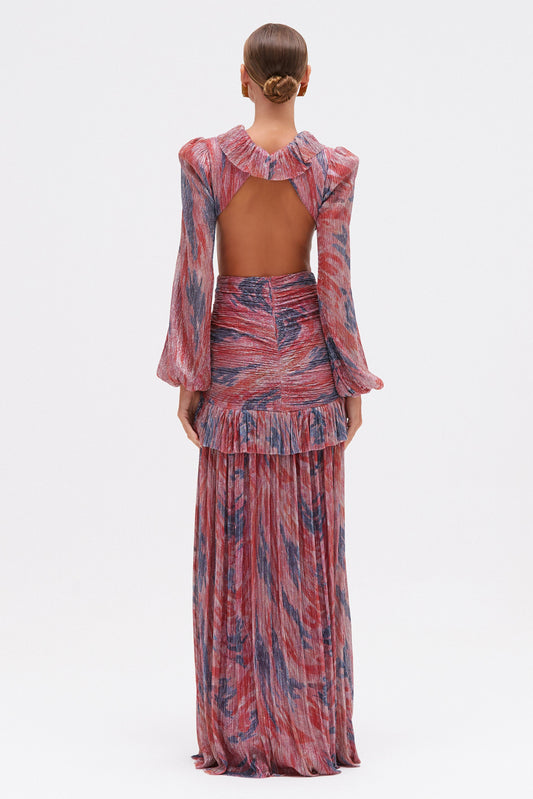 SILK PLISSE LONG DRESS HALTERNECK FLORAL COLLAR