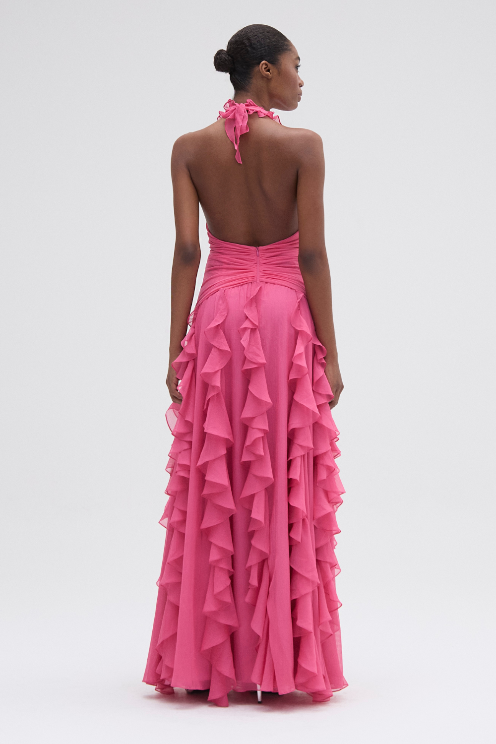 This Silk Plisse Plunge Gown features a deep V neckline with a ruffle outline, a ruching detail on the bodice into a floor length ruffled skirt with full slit. A neck tie closure creating an open back design in addition to a zipper close.