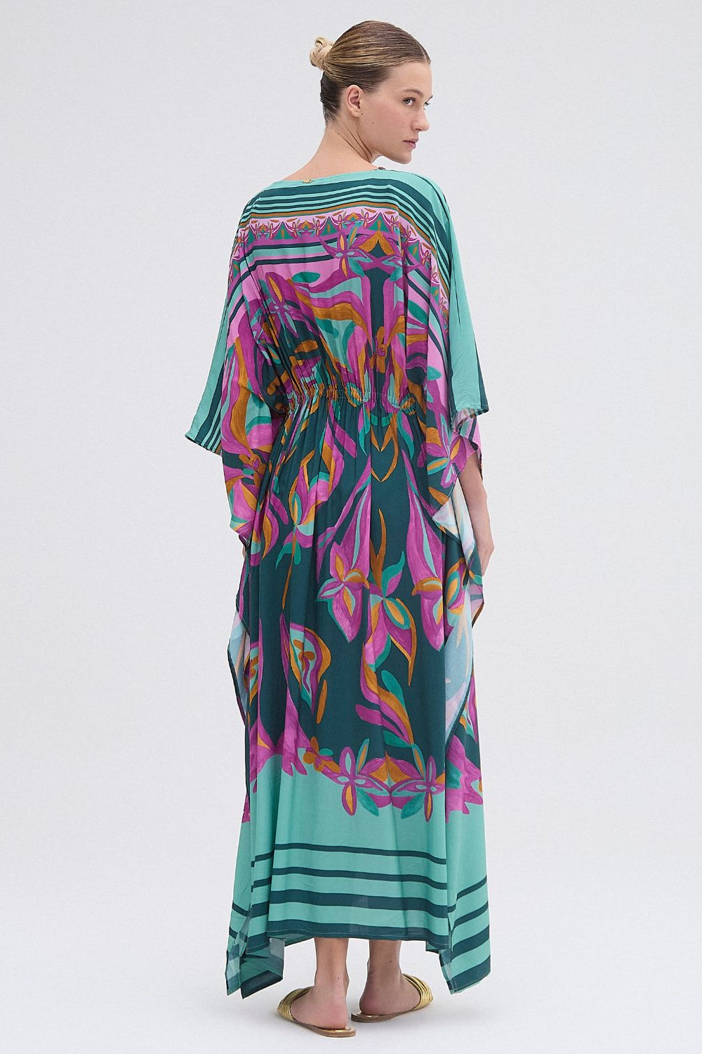 This robe features our new Aljezur pattern, inspired by Portuguese Hand Painted Tiles, echoing the elegance of Azulejos and the beaches of Aljezur, with a plunging braided detail neckline, loose flowy fit and tie closure at the waist.