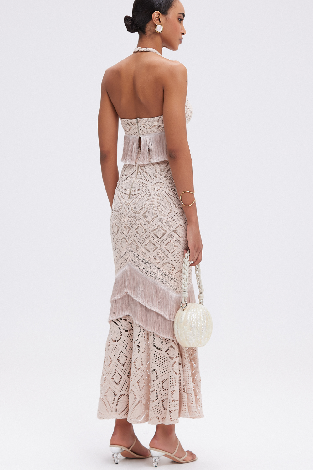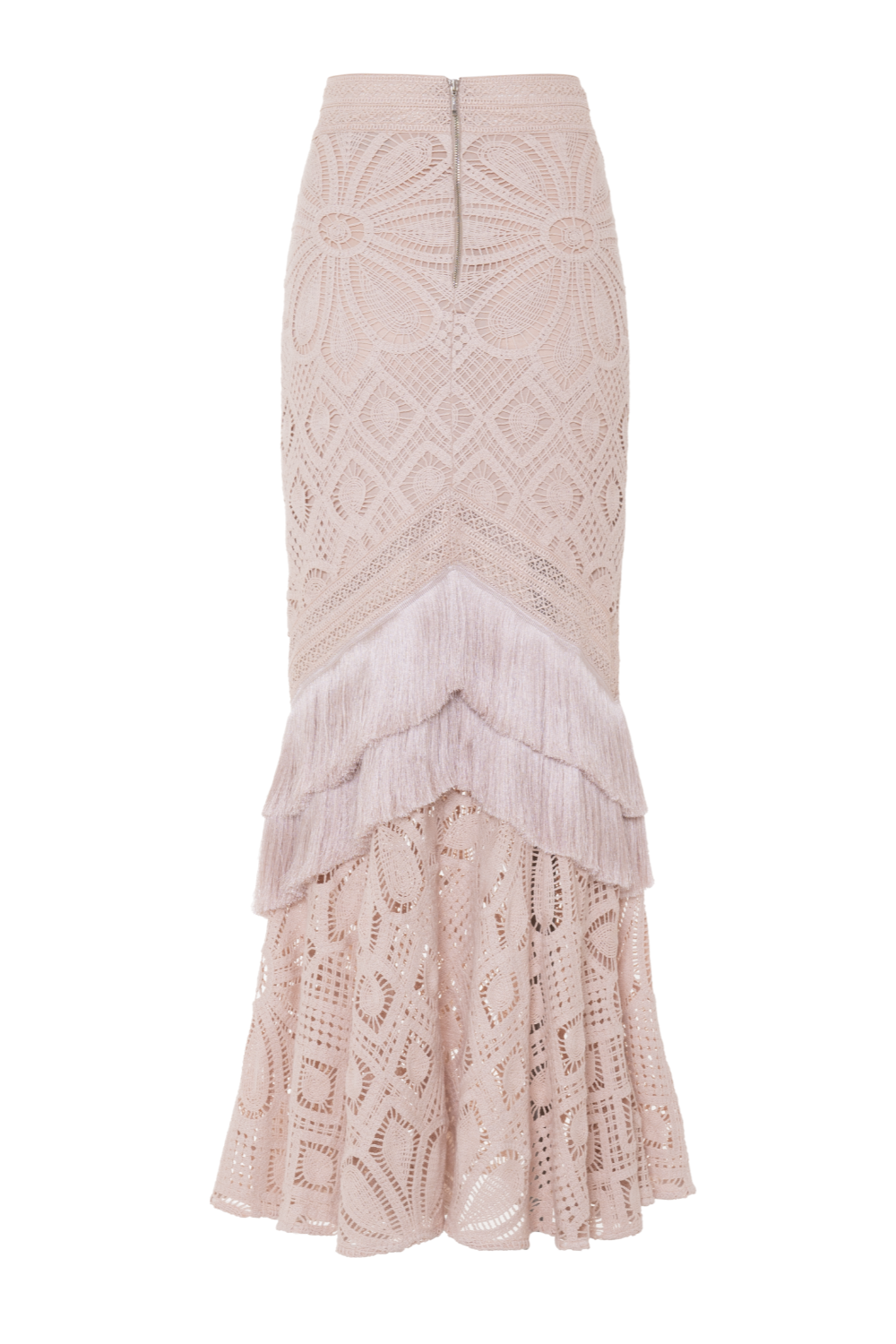 This maxi skirt features a full crochet design with a fitted bodice with lining into a flowy sheer ruffled bottom and layered fringe trim detail. Exposed back zipper closure.