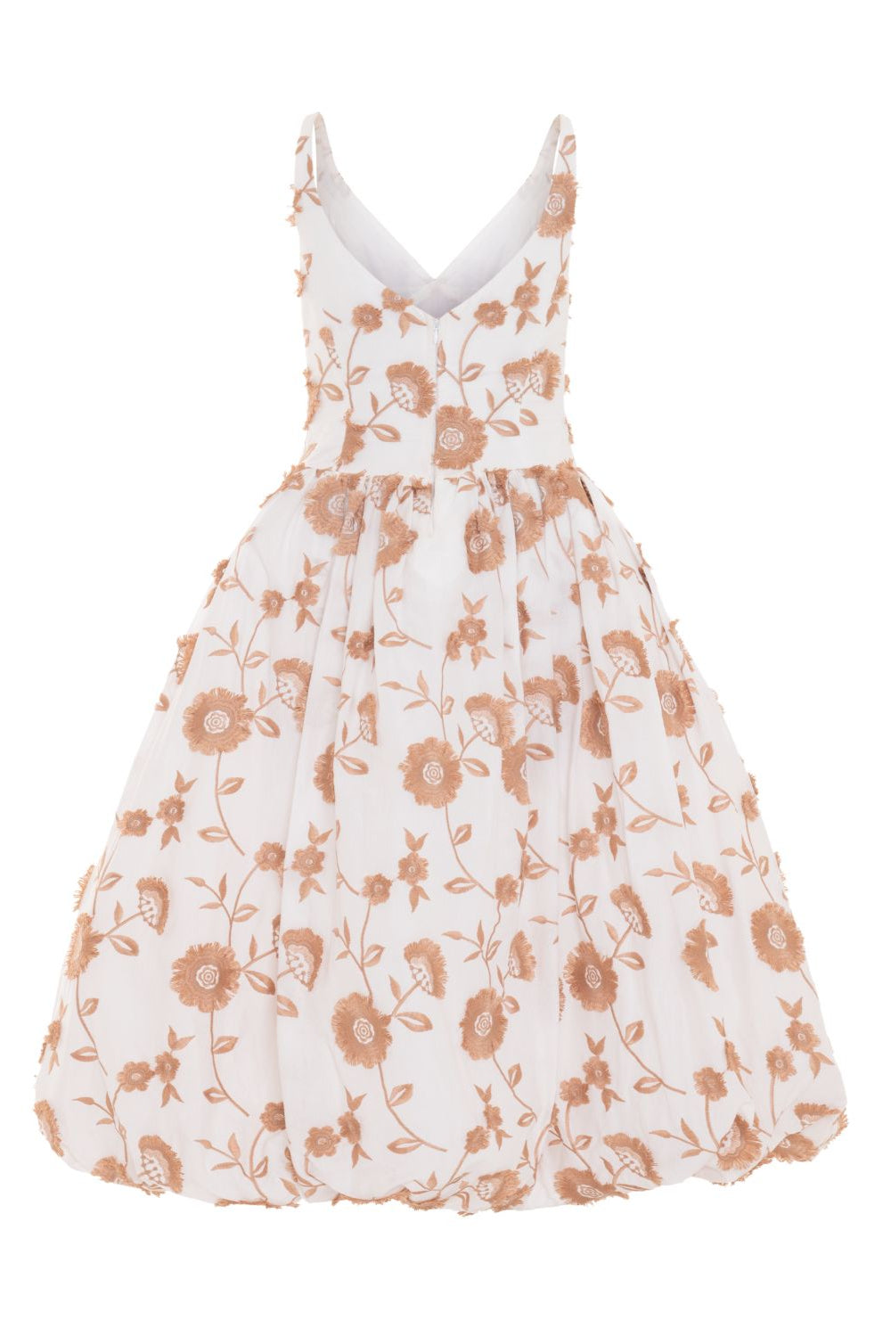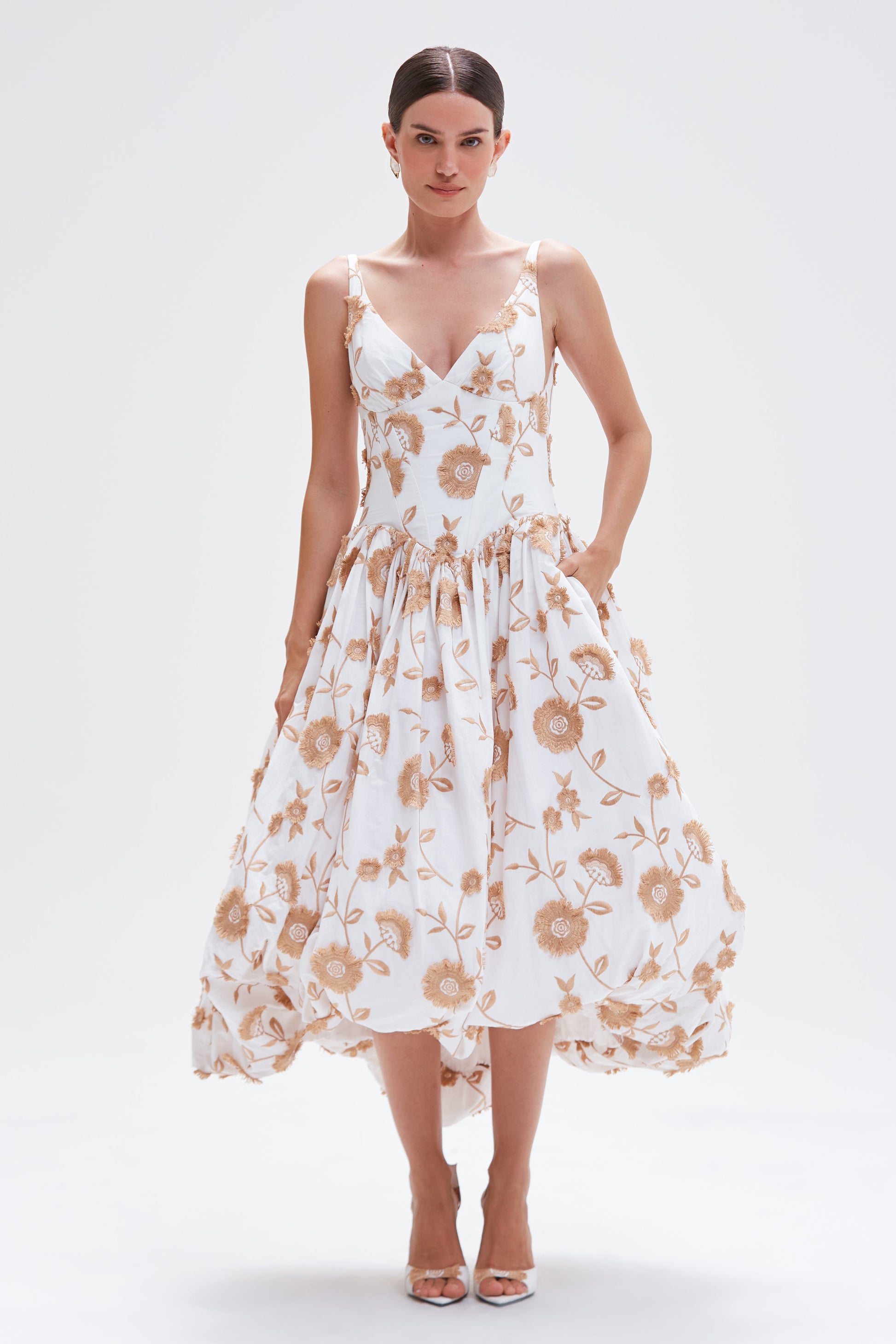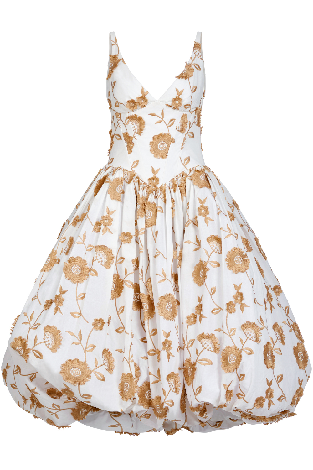 The Botanical Poplin Midi Dress was look 14 in our Spring 25 Runway Collection it features a corset-structured bodice that flows into a dramatic drop-waist skirt, adorned with gold floral detailing throughout. The production version will feature a more streamlined skirt for a refined silhouette. Concealed back zipper closure