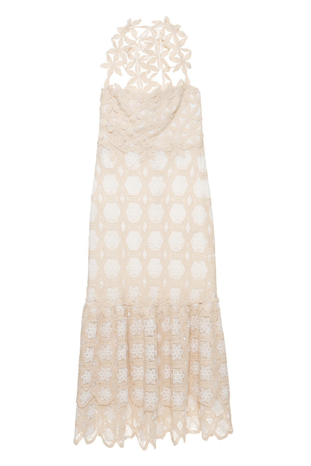 This midi dress features a floral lace square neckline with a slight halter floral strap design, a fitted crochet bodice that is fully lined into a flare pleated lace skirt. Neck tie and exposed zipper closure.