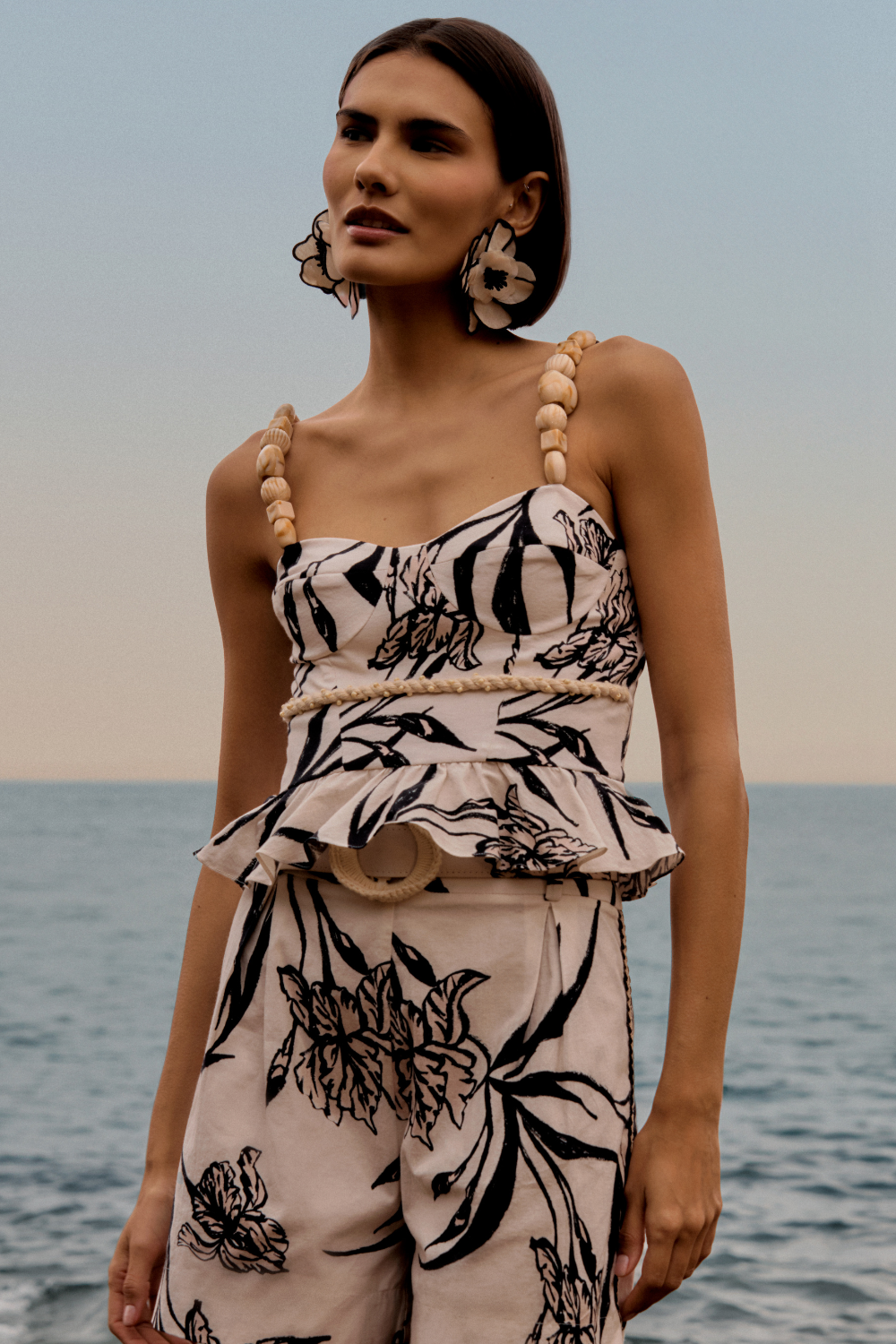 This top features a subtle sweetheart neckline with structured bodice into a peplum hemline. Wooden beaded straps in the front with adjustable detail and exposed back zipper.