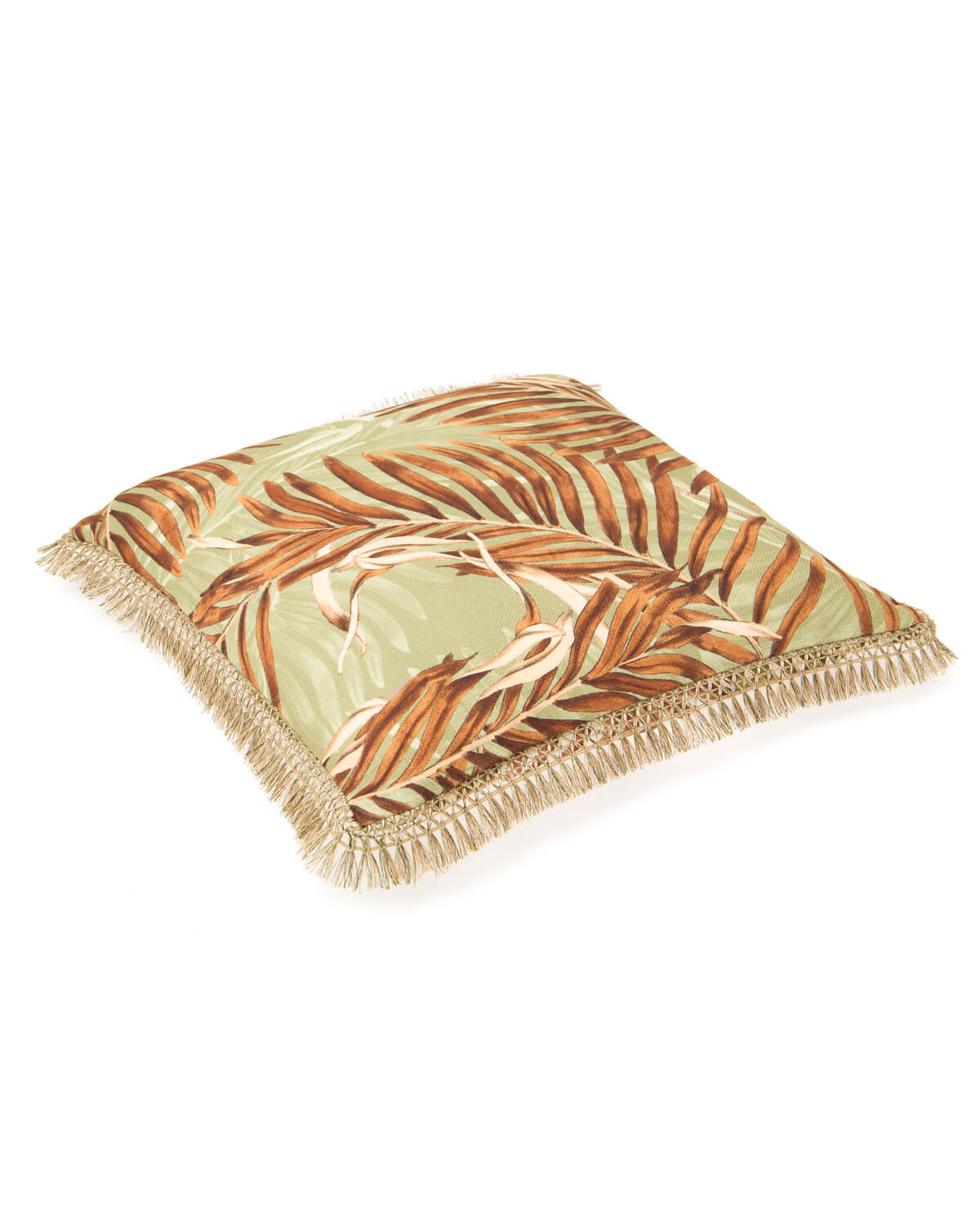 Features our original Palmeira Print. Hand-applied fringe trim. Zip closure. Spot Clean. Dimensions: 16.5" wide x 16.5" tall. In Sage. 100% Polyester. Made In Brazil. ALM12841US