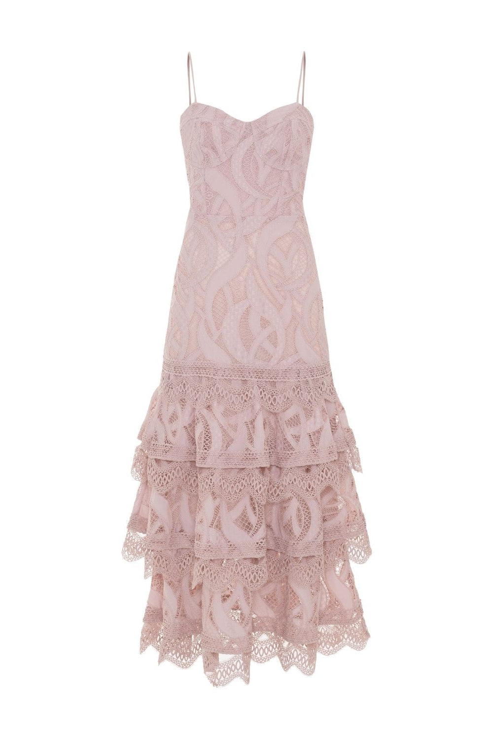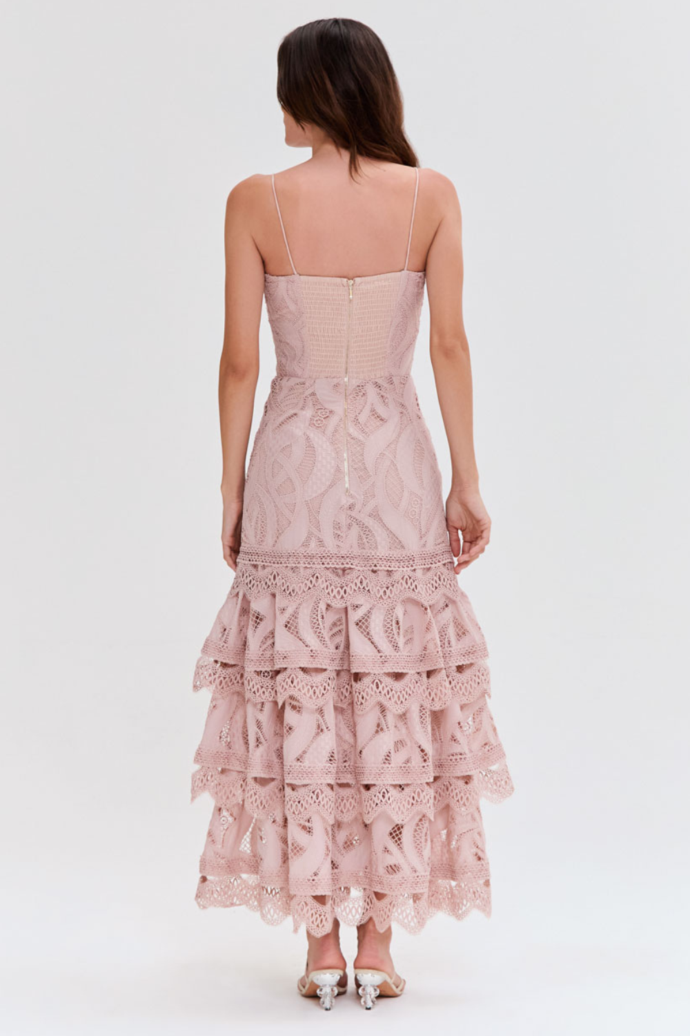This midi dress features our Aura Lace fabric with a bustier style top and fitted bodice into a flutter shaped skirt with a layered hemline of lace. Thin straps, and an exposed back zipper closure.