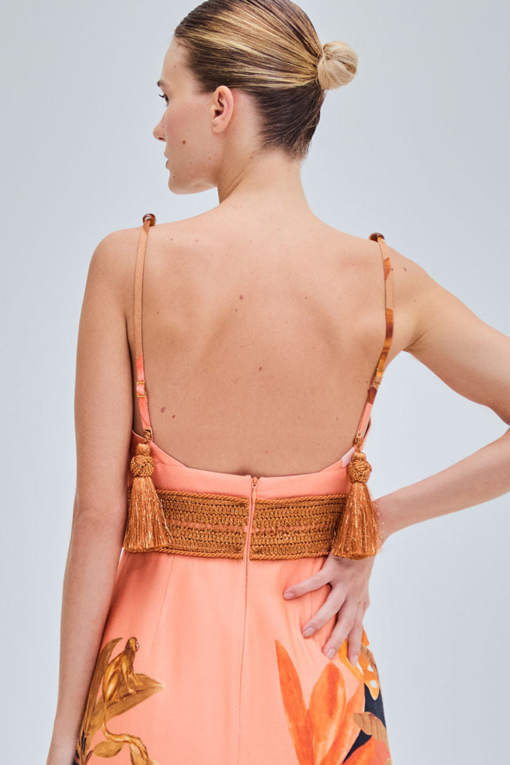 This maxi dress features a V-neckline and a cinched waist with an intricately woven metallic knit design, leading into a flattering full-length skirt in our signature Bananier print. The back showcases an open, strappy design adorned with tassel accents and a exposed zipper closure.