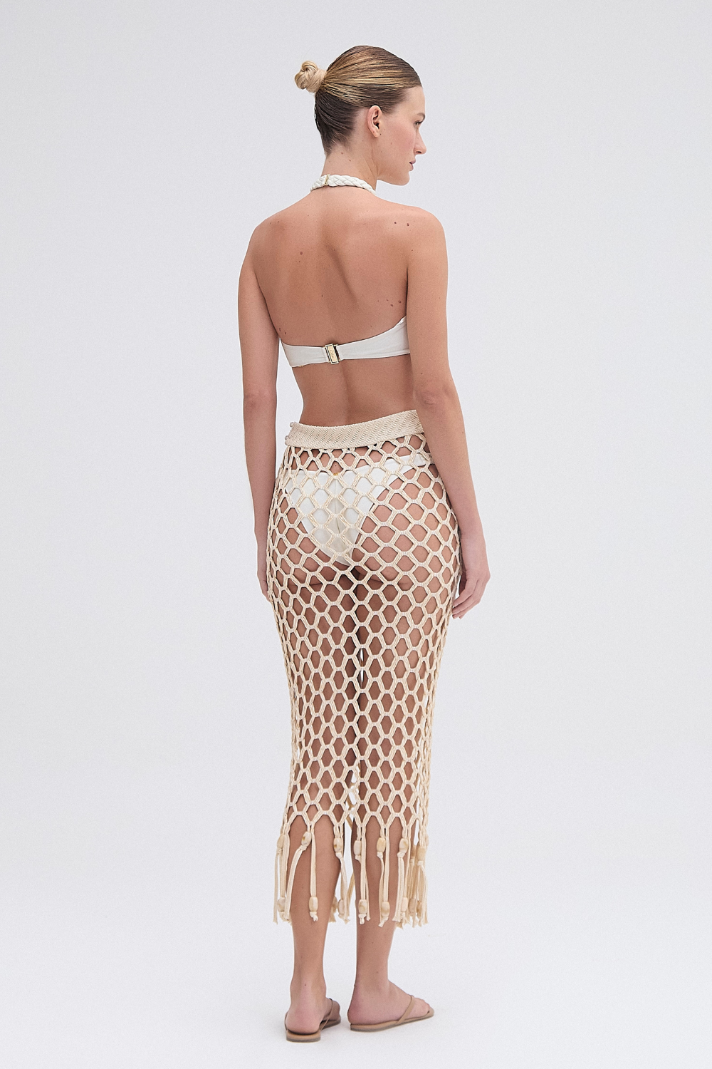 This beach skirt is part of our PatBO X Camila Coelho Capsule Collection it features an open weave design through the body of the skirt with an elastic waist band and a beaded fringe detail throughout the bottom.