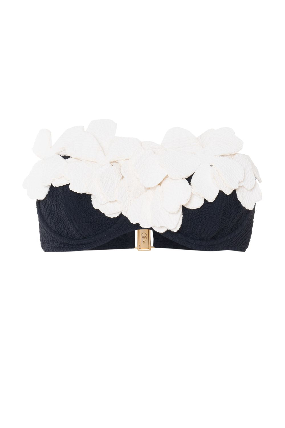 Romantic and playful, this strapless bikini top features a smocked black base adorned with dimensional ivory floral appliqués. Designed for a flattering, secure fit with a standout finish, it’s perfect for making a statement by the pool or styling with the matching bottoms for a cohesive resort look.