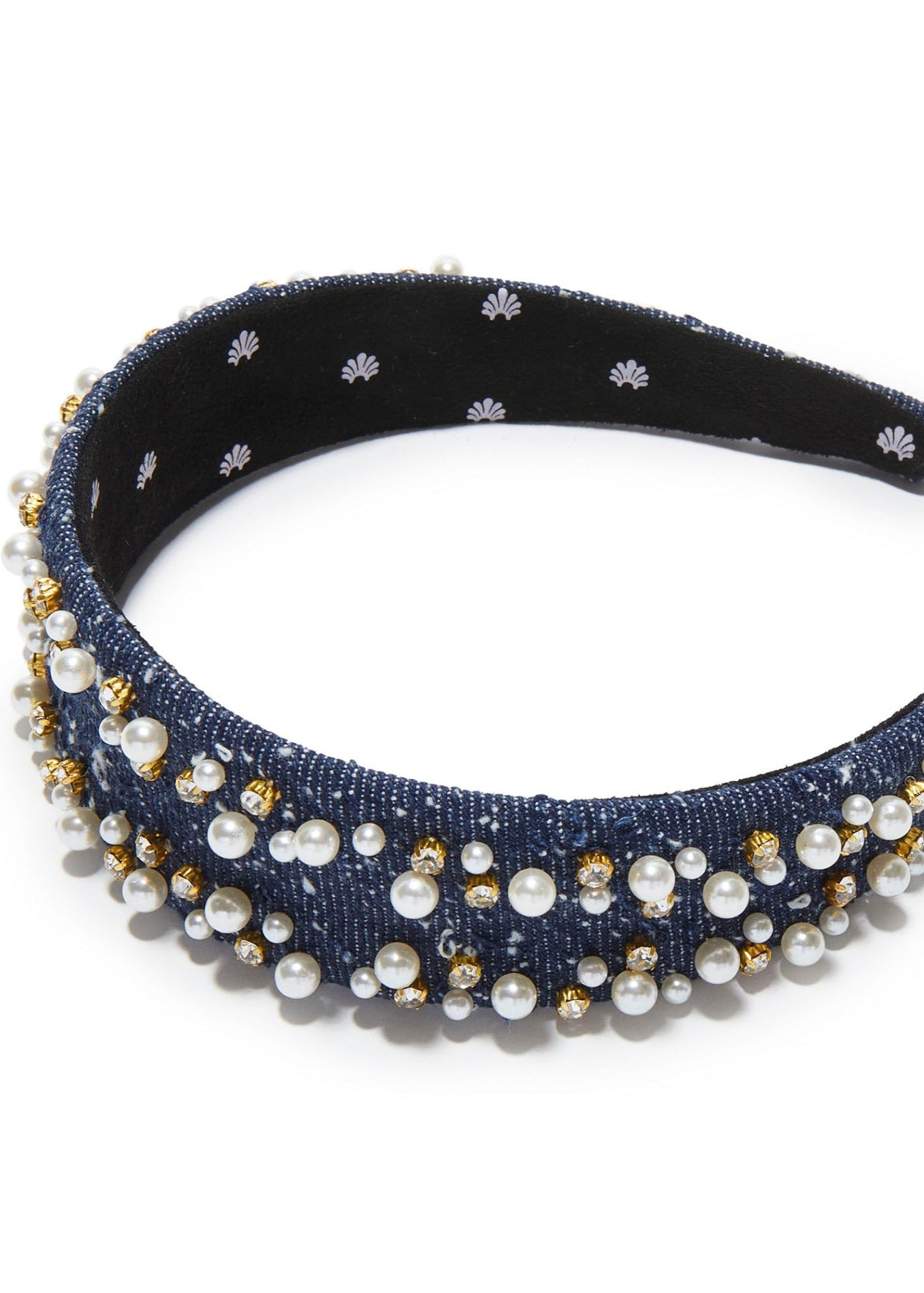 Denim headband embellished with scattered pearl details for a modern twist on a classic accessory. A chic statement piece that effortlessly combines casual charm with refined elegance.