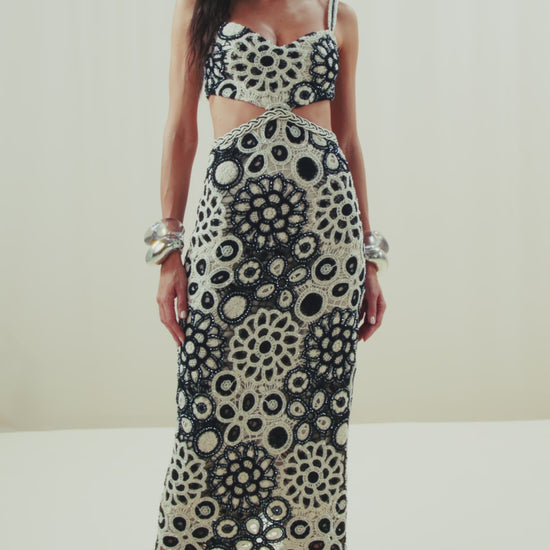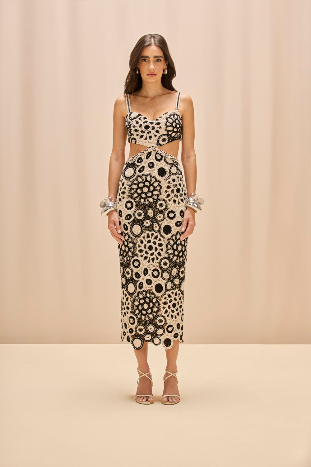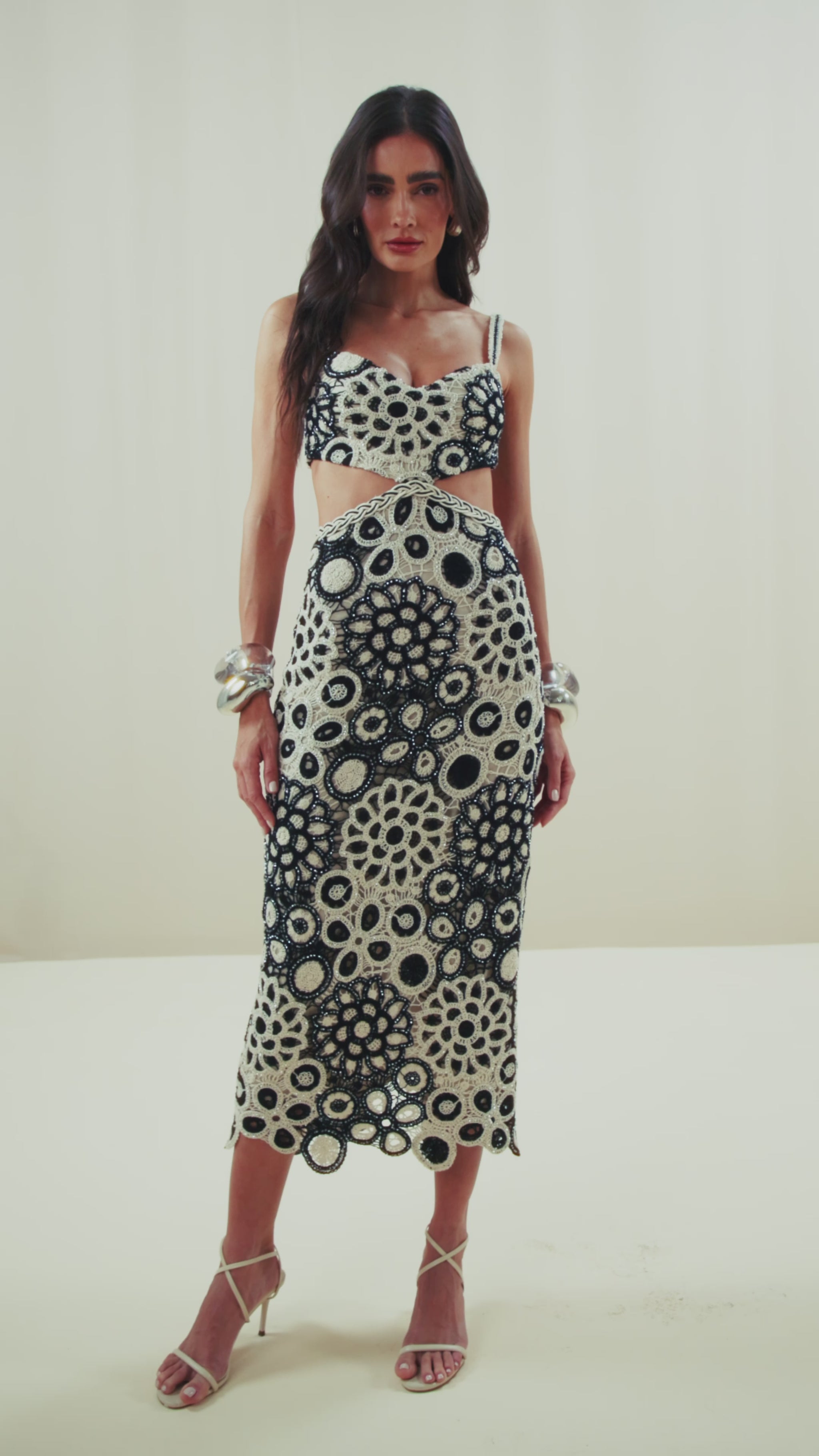 The Coral Crochet Midi Dress is a textured, effortless choice for summer days. Featuring thin adjustable straps with hand-embroidered detailing, it has a sweetheart neckline and a strategic cutout at the waist adorned with braided trims. Finished with a hook-and-eye closure and an invisible back zipper, it blends casual elegance with a touch of artisanal charm.