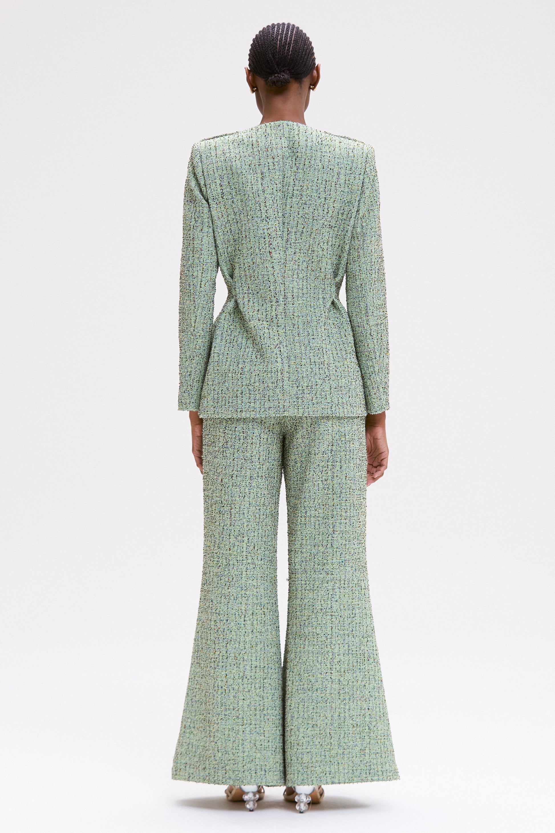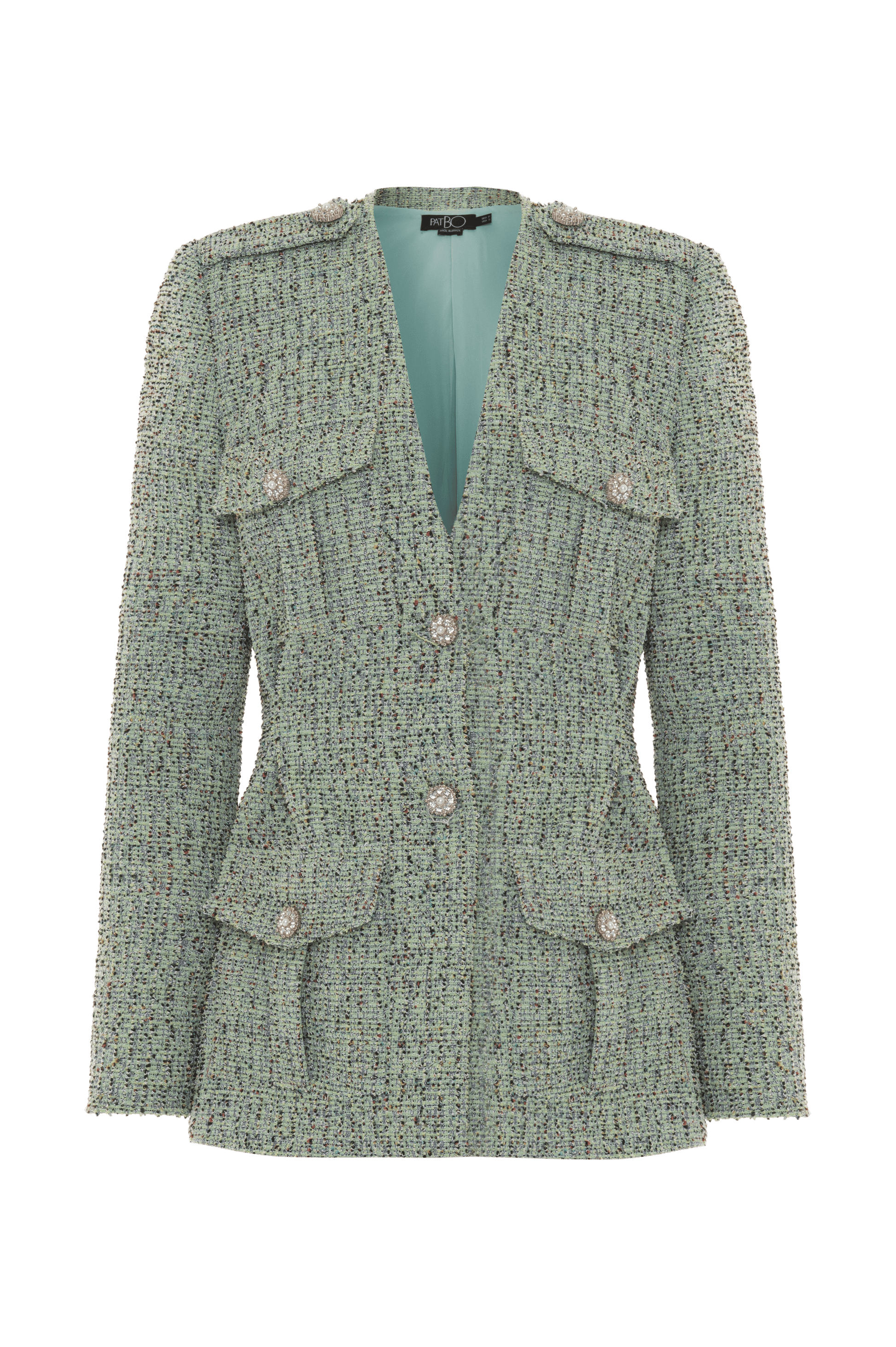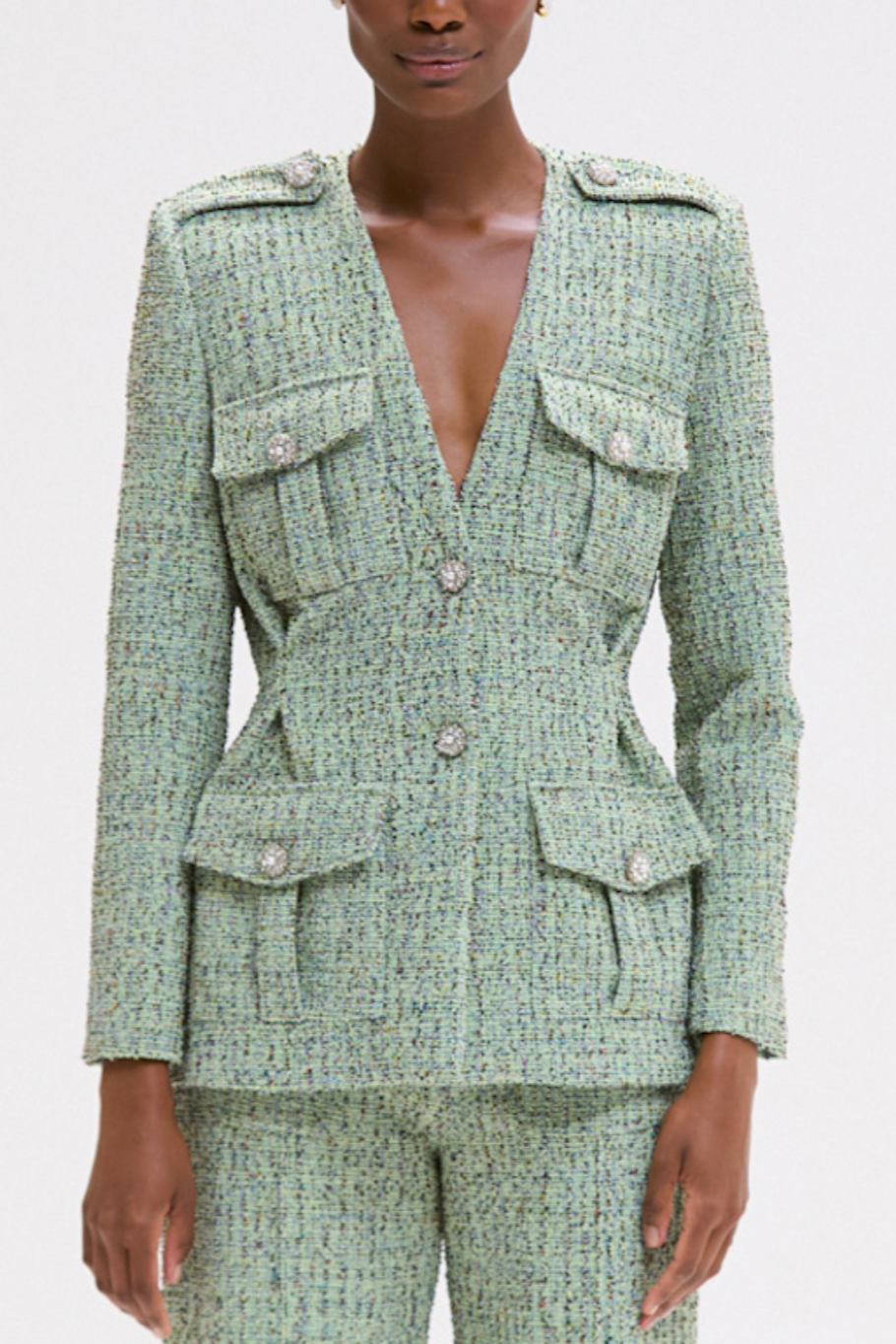 The Crystal Tweed Blazer is a tailored statement piece with personality. Featuring jewel-like buttons, four front cargo pockets, shoulder pads, and a cinched waist, it sculpts the body while adding a classic and sophisticated touch to any look