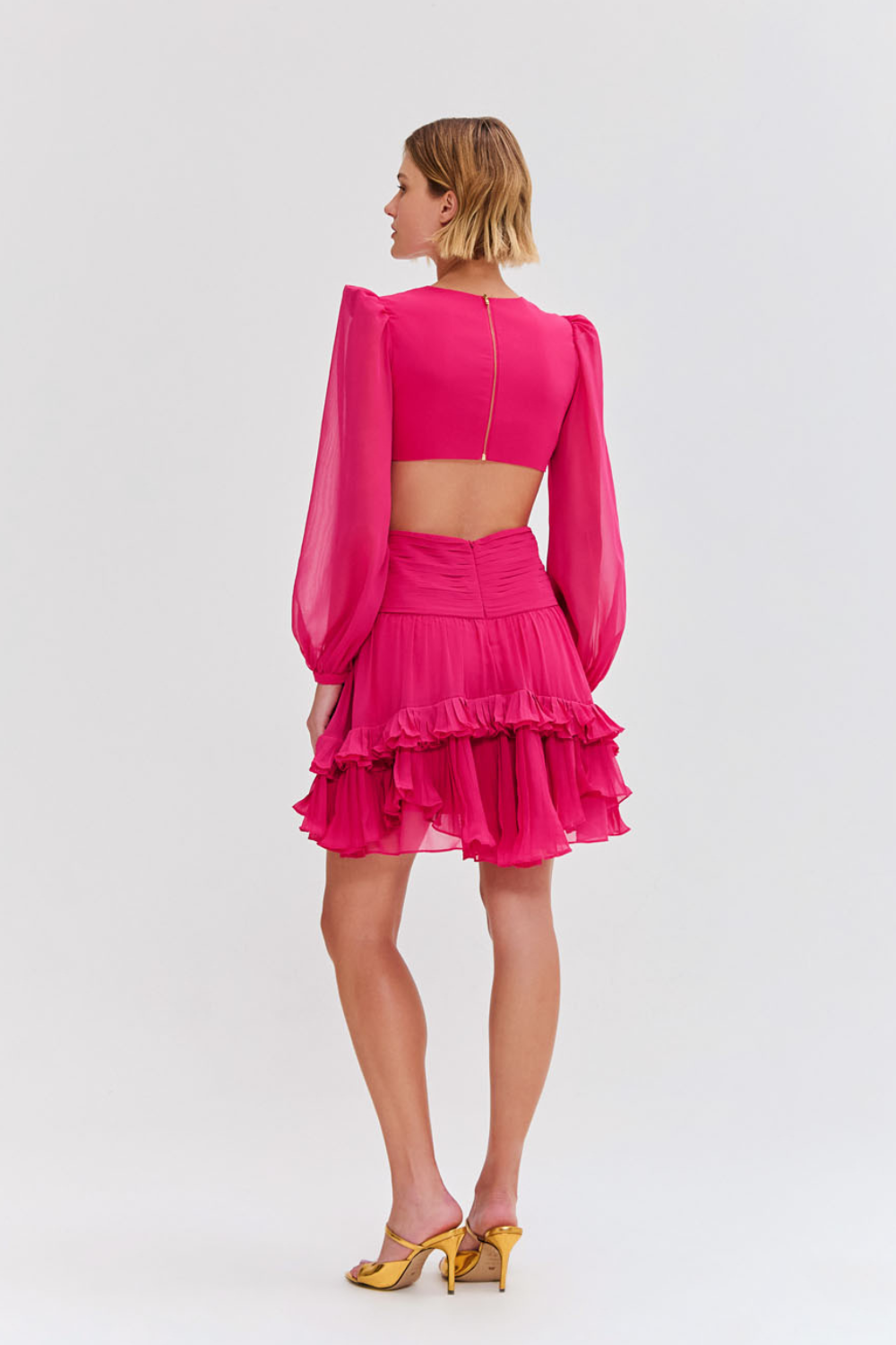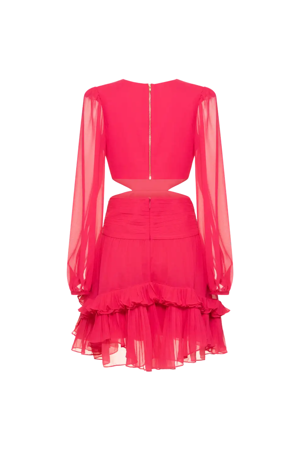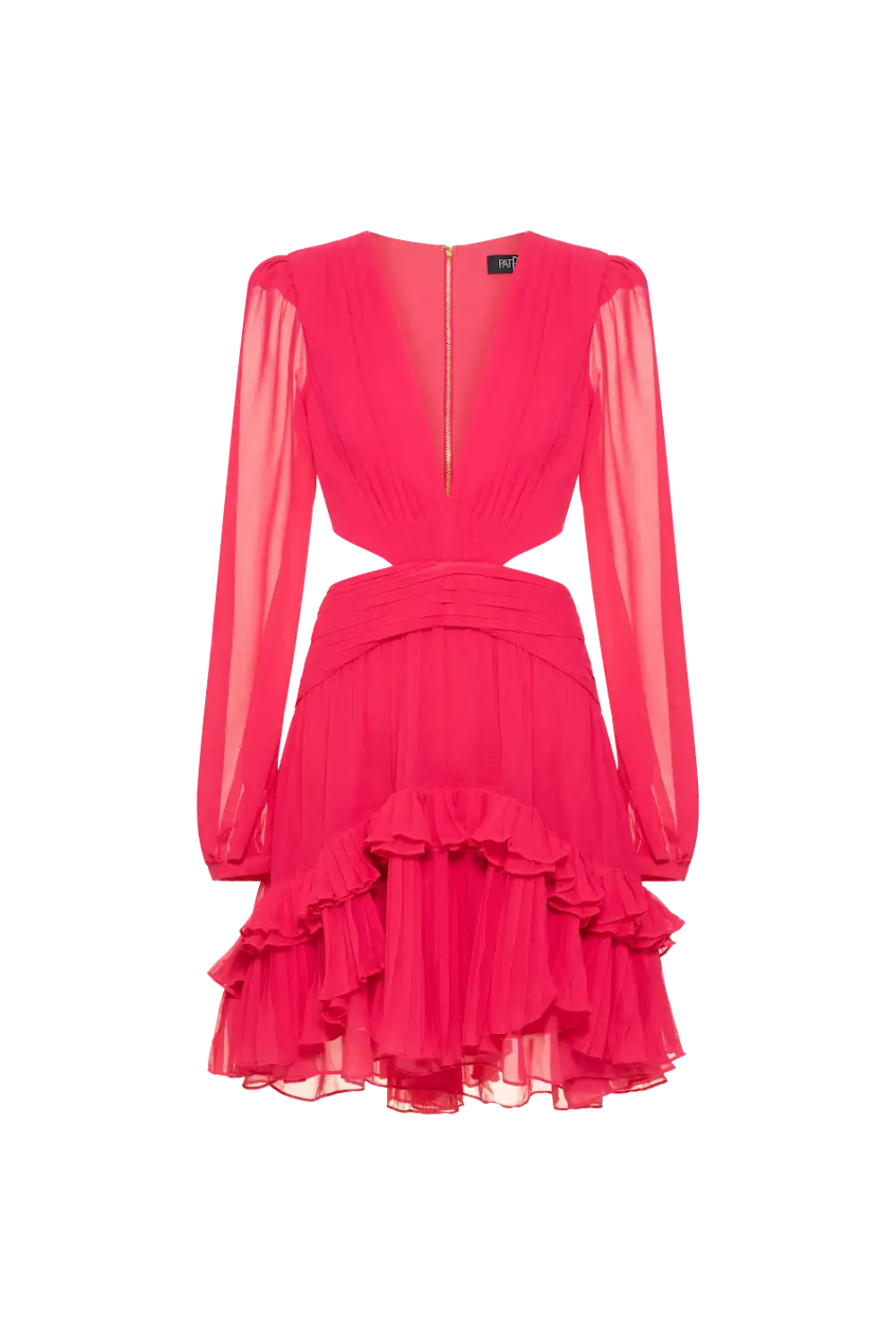 This deep neck, plunge chiffon dress features pleated detail and ruffle trim. Ribcage cut-outs and flowy sleeves. Mini dress is fully lined. Exposed back zipper. Model wears a size 4.