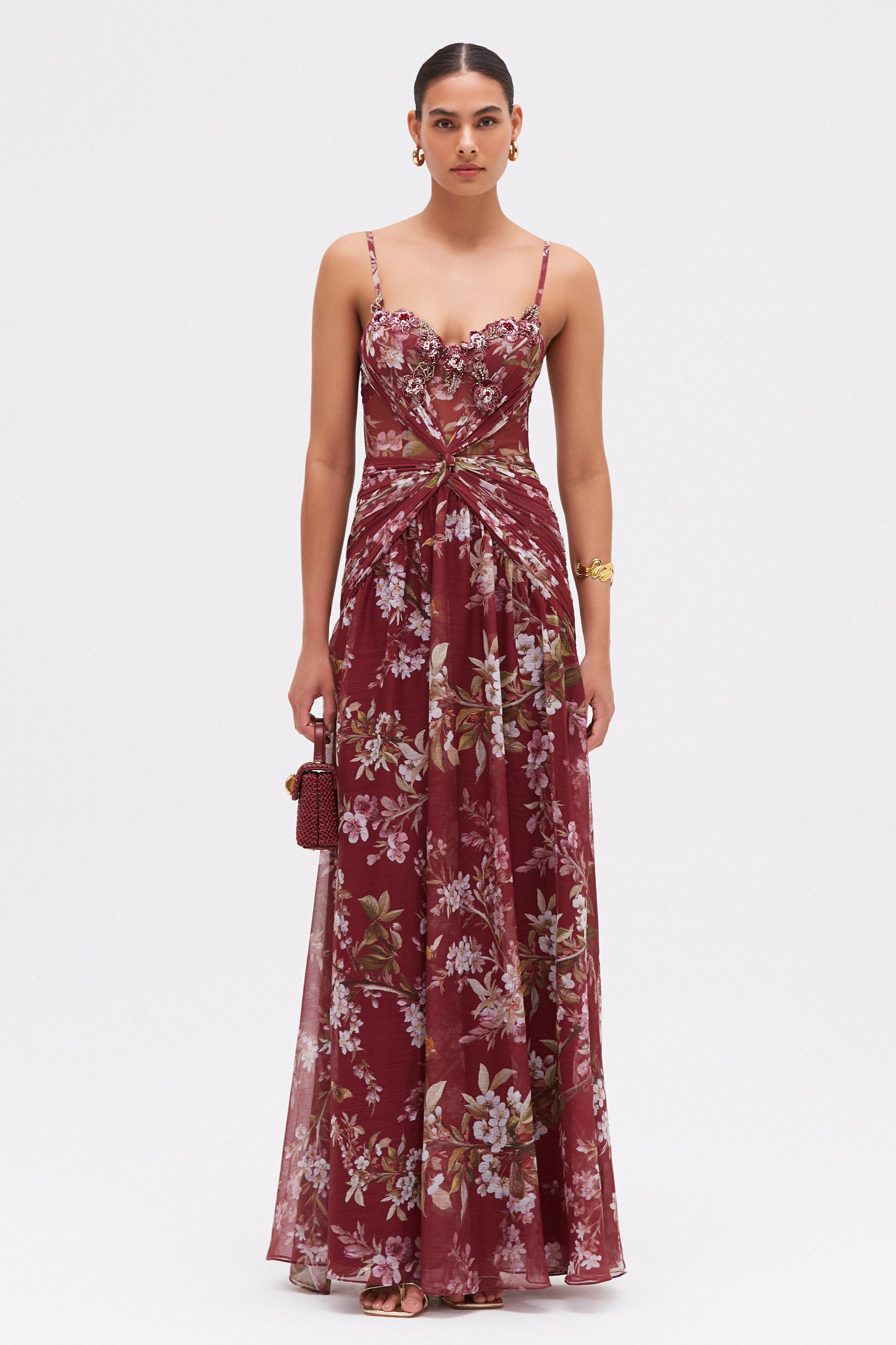 The Delicata Beaded Gown is a striking floor-length dress adorned with the exclusive floral motif. Delicate hand-embroidered appliqués bloom along the bust, adding texture and artistry to the sheer tulle base.The knotted front detail and flowing skirt enhance the hourglass silhouette. Back concealed zipper closure.