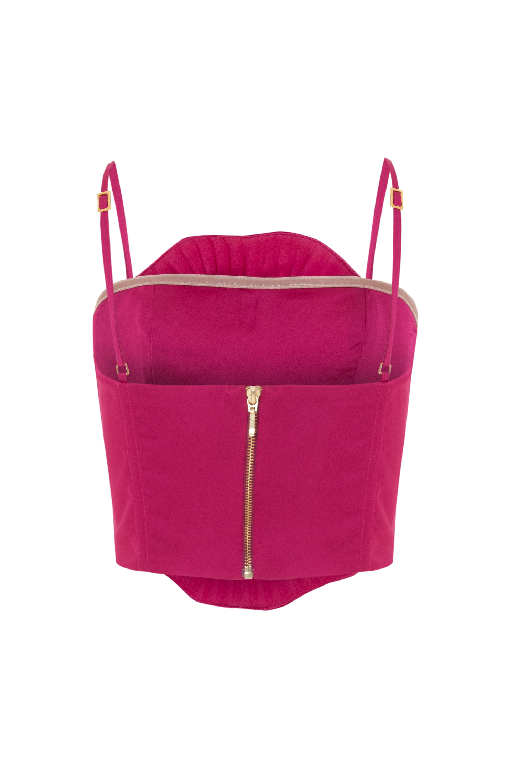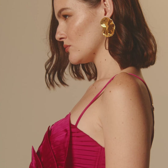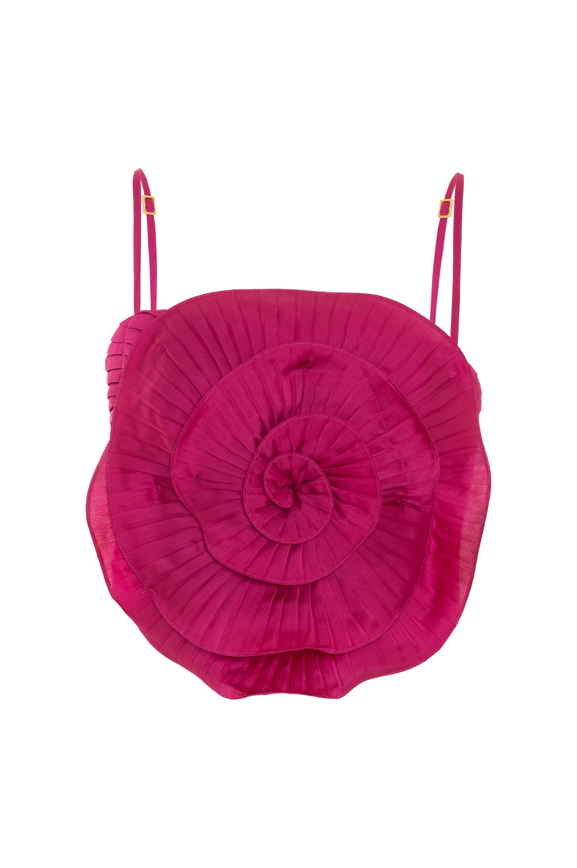 Satin top with full lining, adorned with an elegant pleated embroidered flower on the front, delicate bust pleats, adjustable thin straps, and a sleek metal zipper at the back.