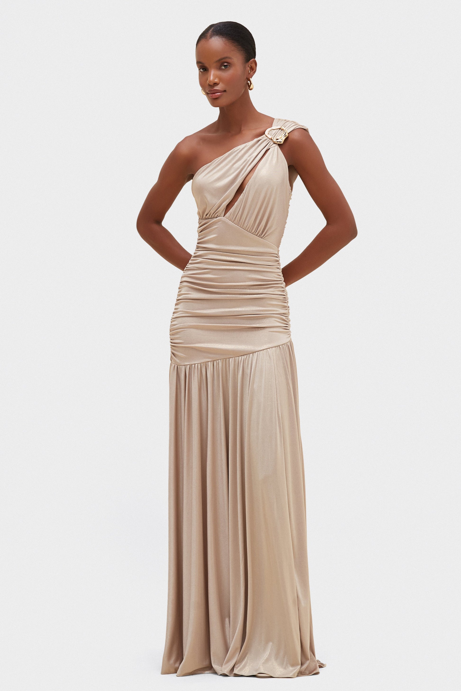 This Dune Jersey One Shoulder Gown features a shiny light fabric with a one shoulder neckline, keyhole cutout, ruching along the bodice of the dress into an asymmetrical skirt.