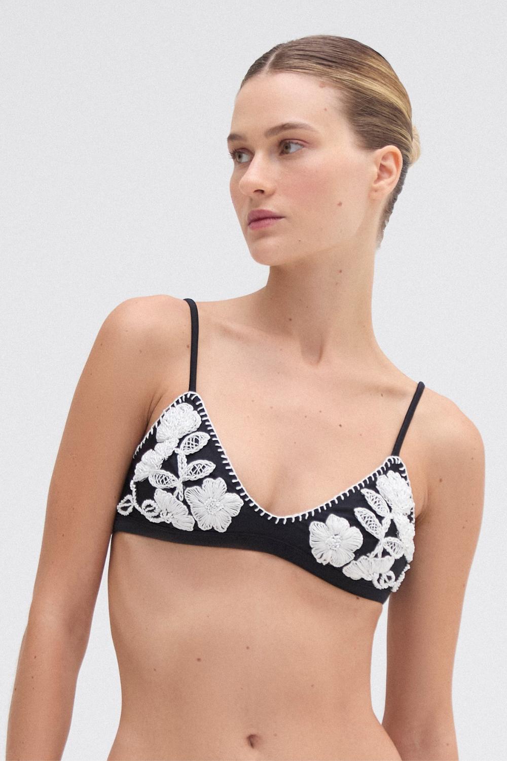 This classic triangle bikini top features embroidered floral detail with stitching outline. Adjustable straps and a back clasp closure.