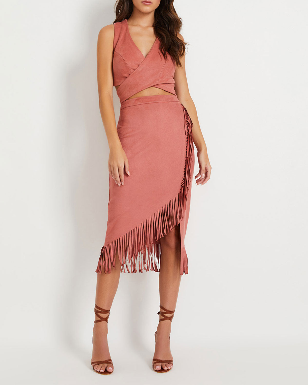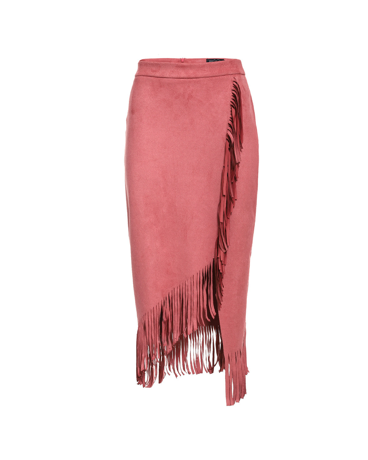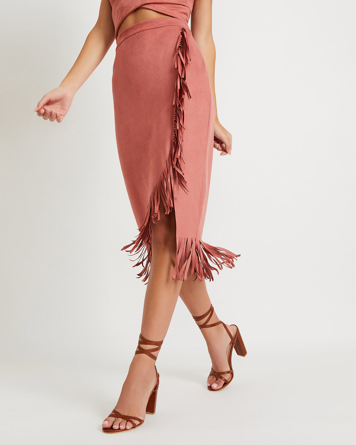 Our iconic skirt styled in an ultra-soft suede fabric. High waist fit featuring a side slit with fringe details at the hem. Concealed side zip fastening. Model is wearing a size 4.