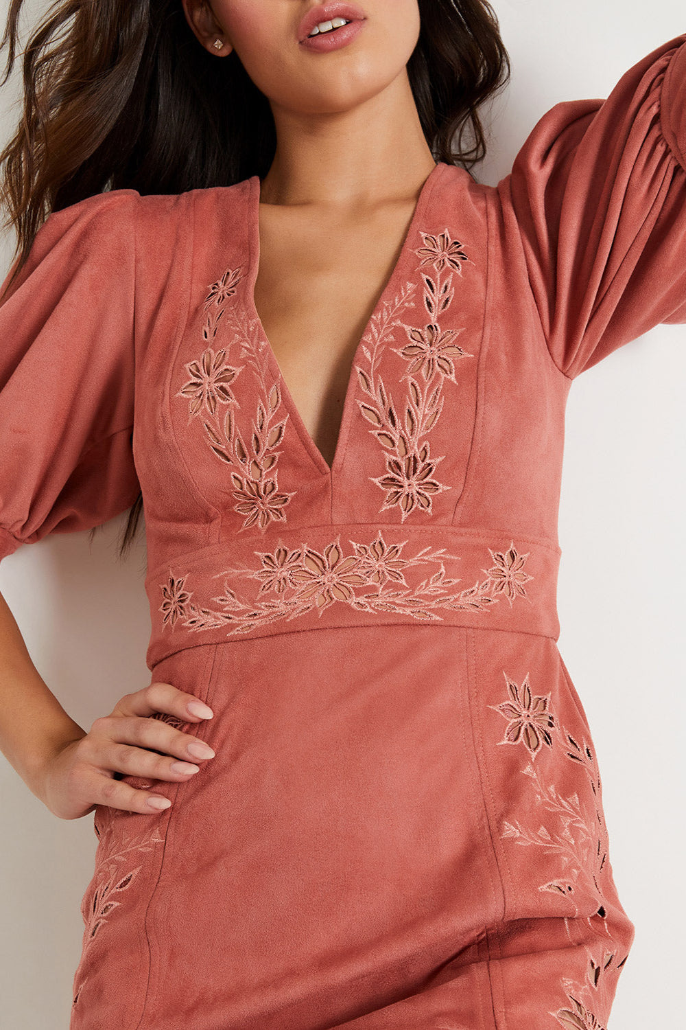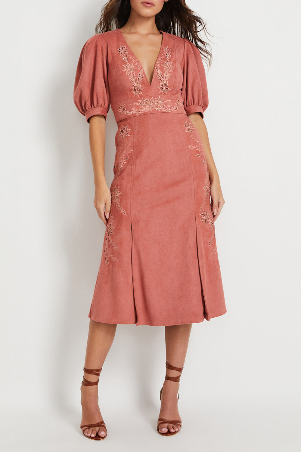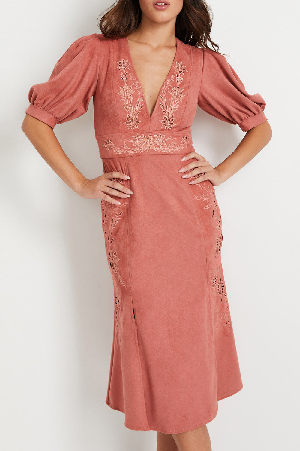 This fit-to-flare midi dress is made from a super-soft faux suede fabric. Lasercut details throughout are lined with nude-colored silk. Deep v-neckline is framed with embroidery. Short, puff sleeves. Fitted skirt features a flared hem with two subtle side slits. Runs true to size.