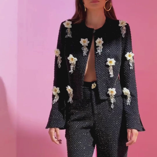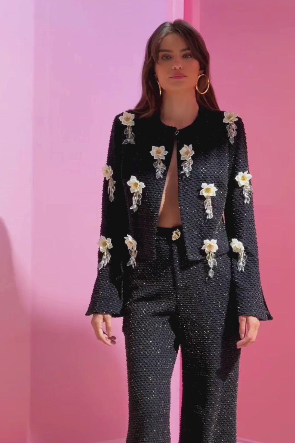 With just the right amount of shimmer and sophisticated texture, these straight-leg jacquard knit pants with lurex are the perfect translation of classic style with a contemporary twist. The timeless silhouette gains extra elegance through the structured waistband and special gold button. Side welt pockets add practicality without sacrificing sophistication.