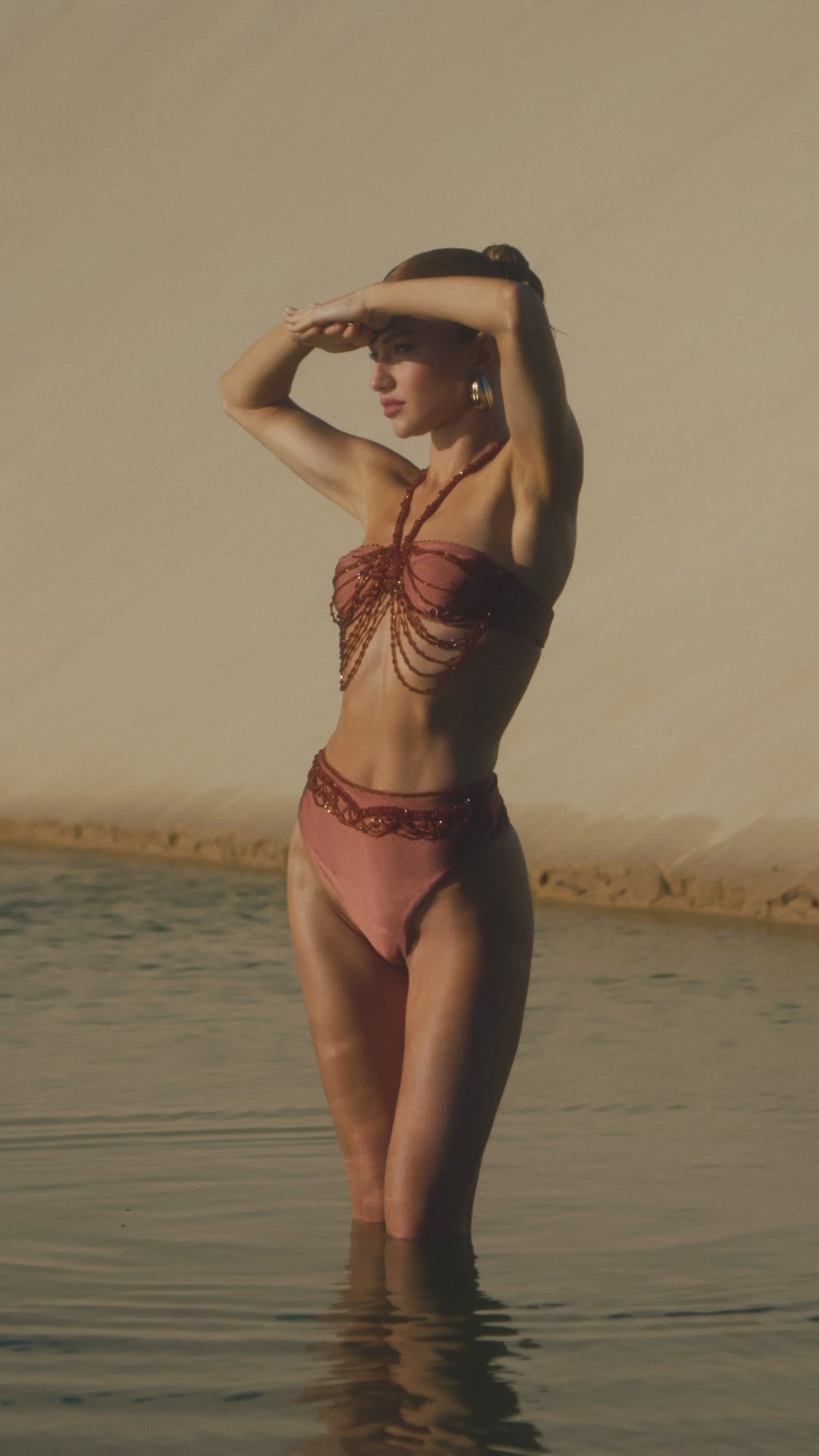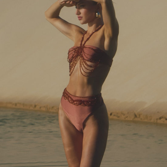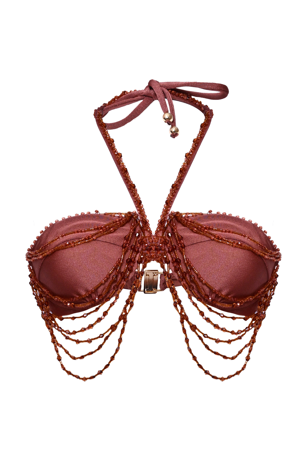 This Golden Dune Lycra Halterneck Embroidered Bikini Top is a true jewel of beachwear. The underwire cups provide support, while the beaded straps and crystal fringes add a special touch of movement and glamour. Finished with a back clasp closure.