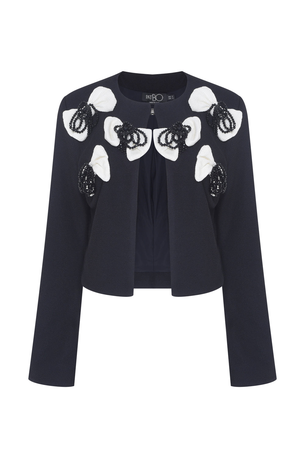 A playful twist on classic tailoring, this black knit jacket is adorned with contrasting hand-applied knit bows embellished with black beaded fringe. The clean silhouette, collarless neckline, and cropped length give it a contemporary feel, while the textured finish brings a cozy sophistication.