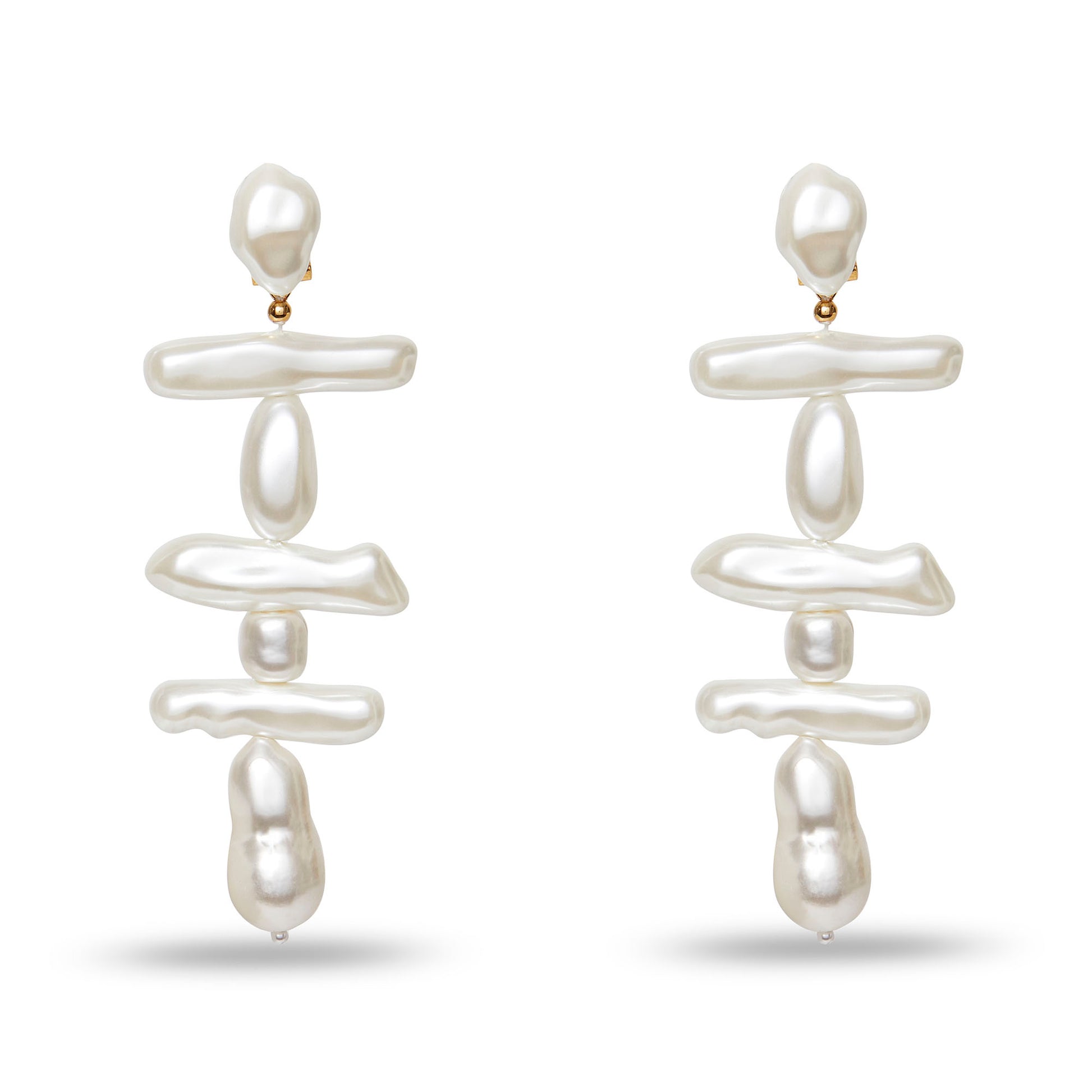 Linear earrings crafted with stacked baroque pearls in organic shapes, creating a modern architectural silhouette. A statement design that blends natural elegance with contemporary sophistication.