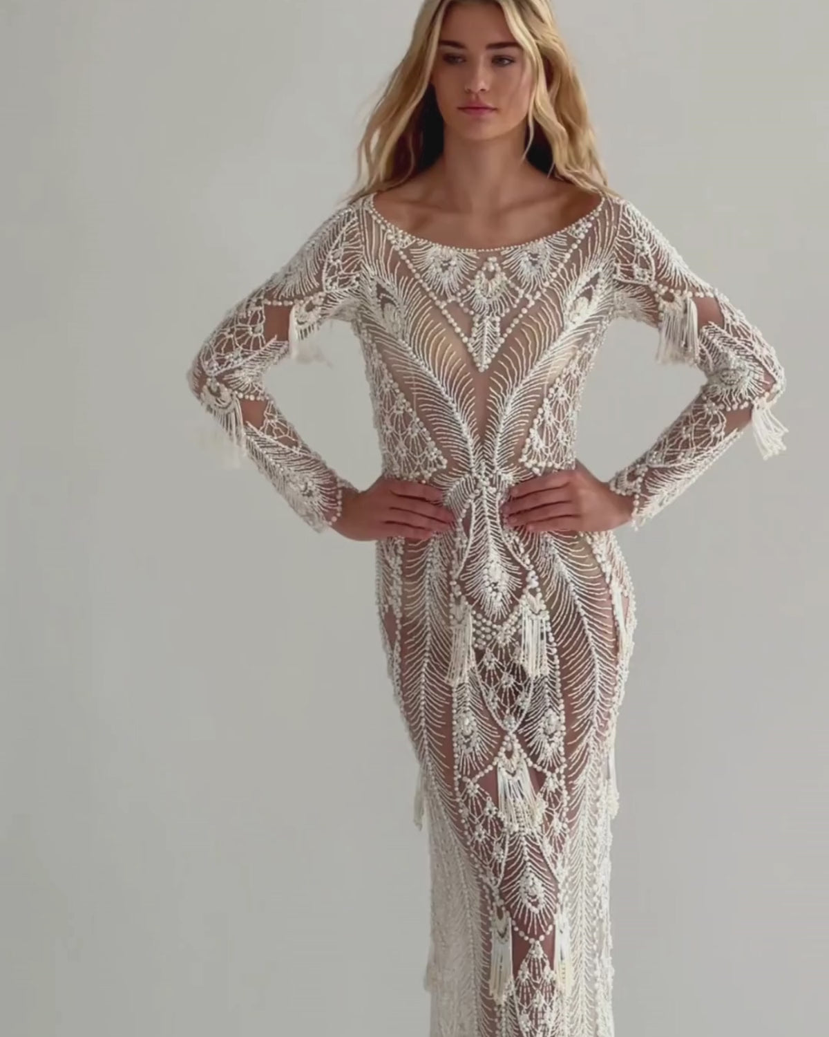 The Hand-Beaded Illusion Tulle Gown is part of the Spring 2024 Runway Collection. Due to the hand-beaded and hand-sewn embellishments, this gown takes more than 48 days to make. It is made from illusion tulle fabric and features an intricate lattice-work pattern of white and ivory hue glass tube beads. The dress has an open back with a back zip closure.