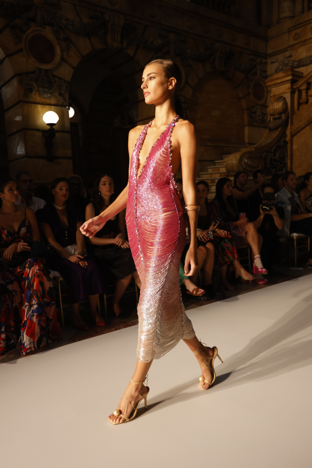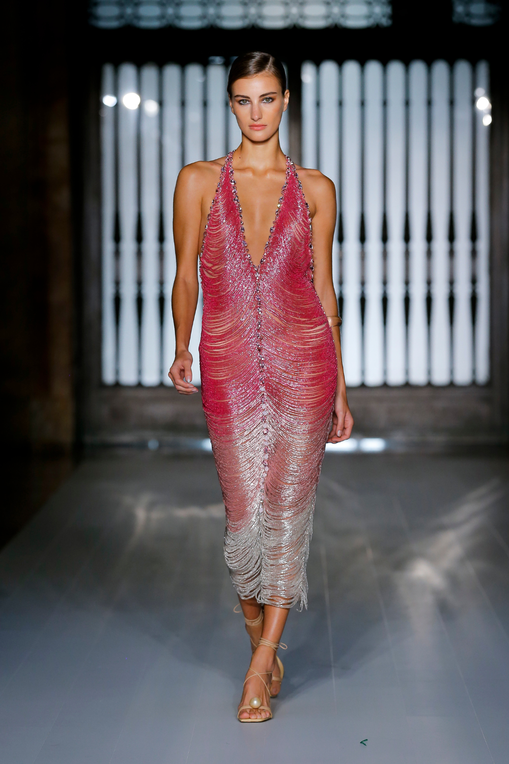 The Hand-Beaded Ombre Gown is part of our Spring 2023 Runway Collection. The hand-strung and beaded fringe adorn this midi dress in ombre crystals. The intricate beading takes 45 days to make. The racerback dress features a neck closure and lining.