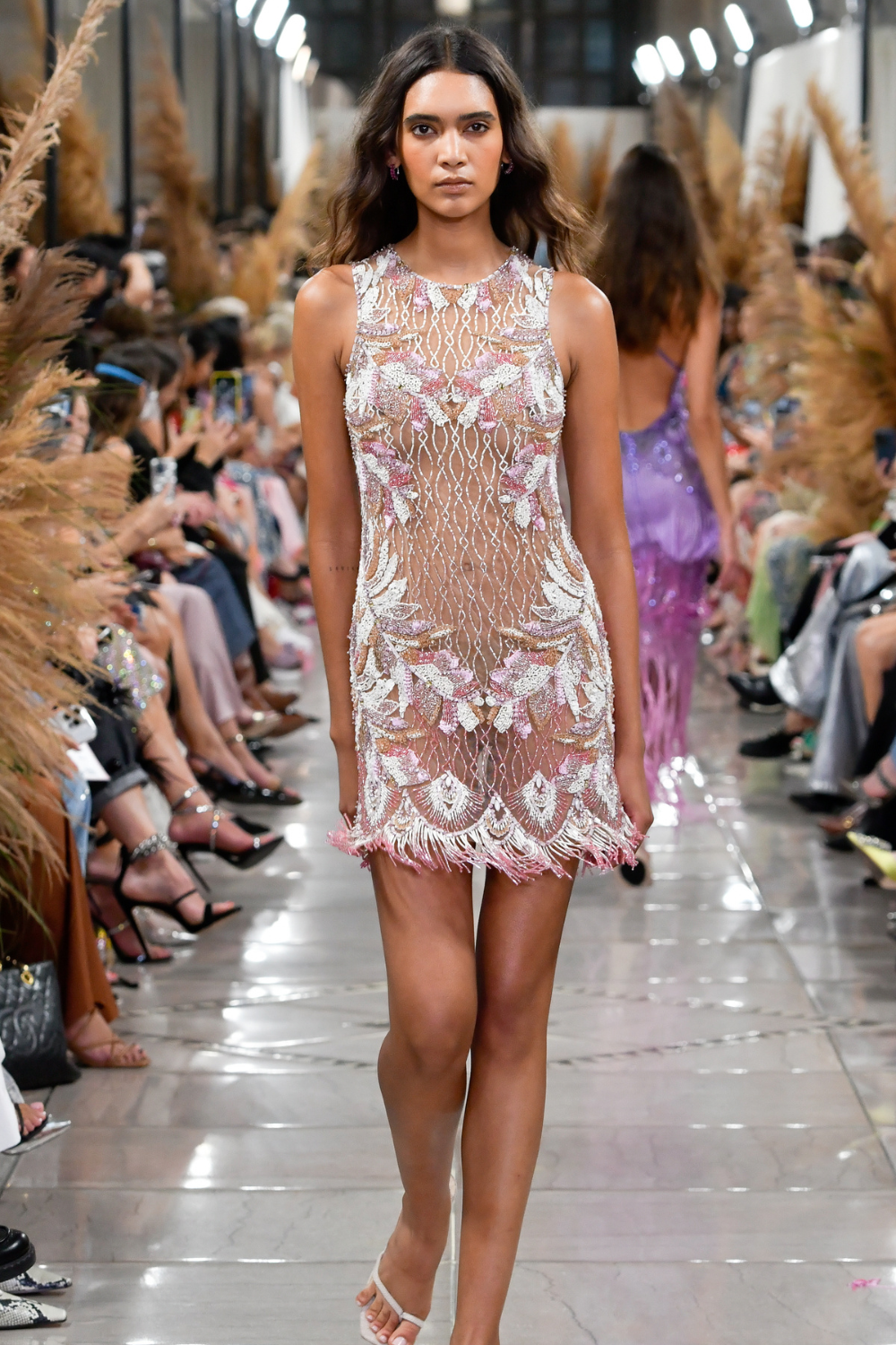 The Hand-Beaded Sleeveless Mini Dress is part of the Spring 2024 Runway Collection. Due to the intricate hand-beaded and hand-sewn embellishments throughout, this dress takes more than a month to make. It is made from an illusion tulle fabric and features more than a dozen different types of glass beads. Concealed back zipper closure.