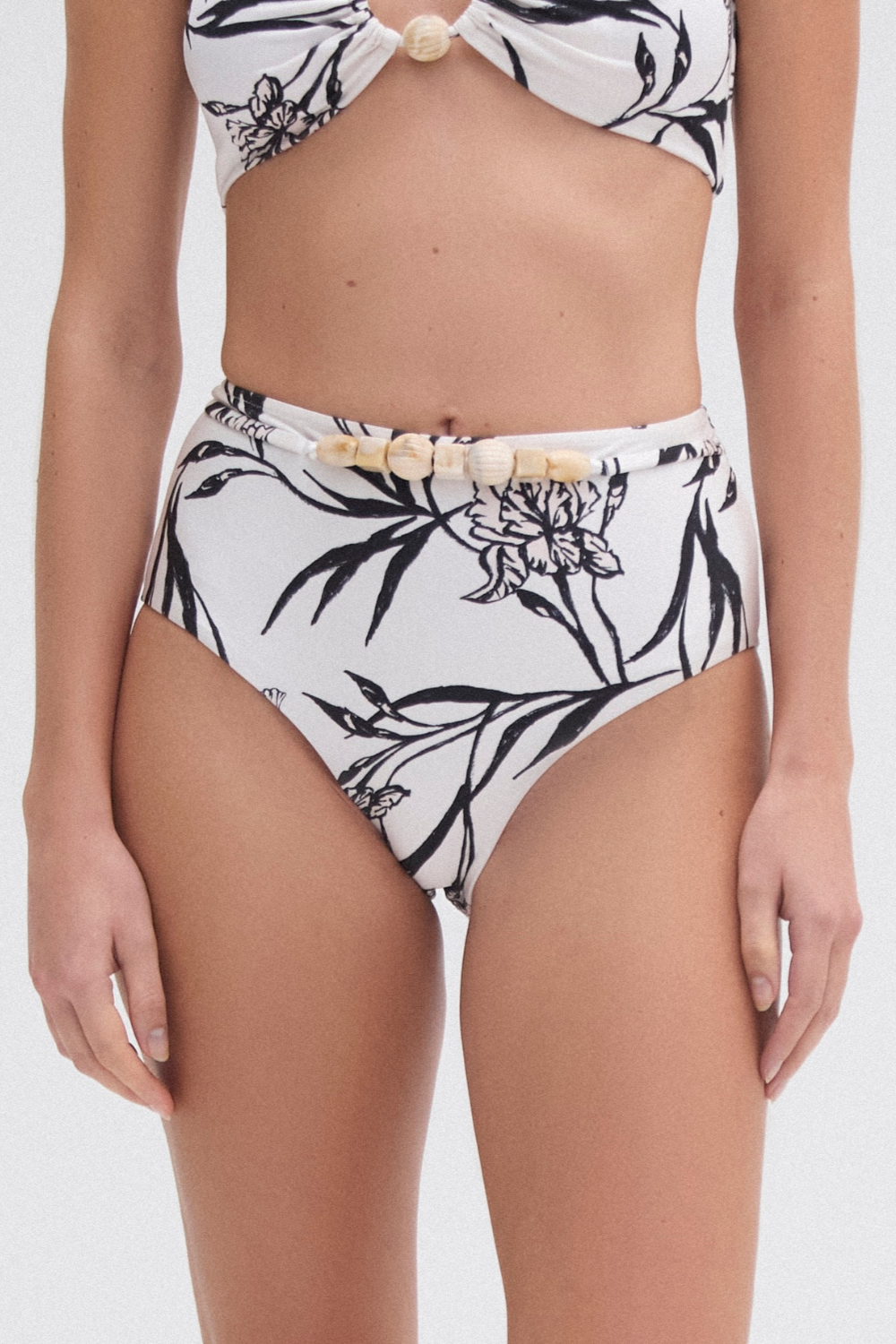High waist bikini bottom with shell embroidered belt detail in our Iris floral print.
