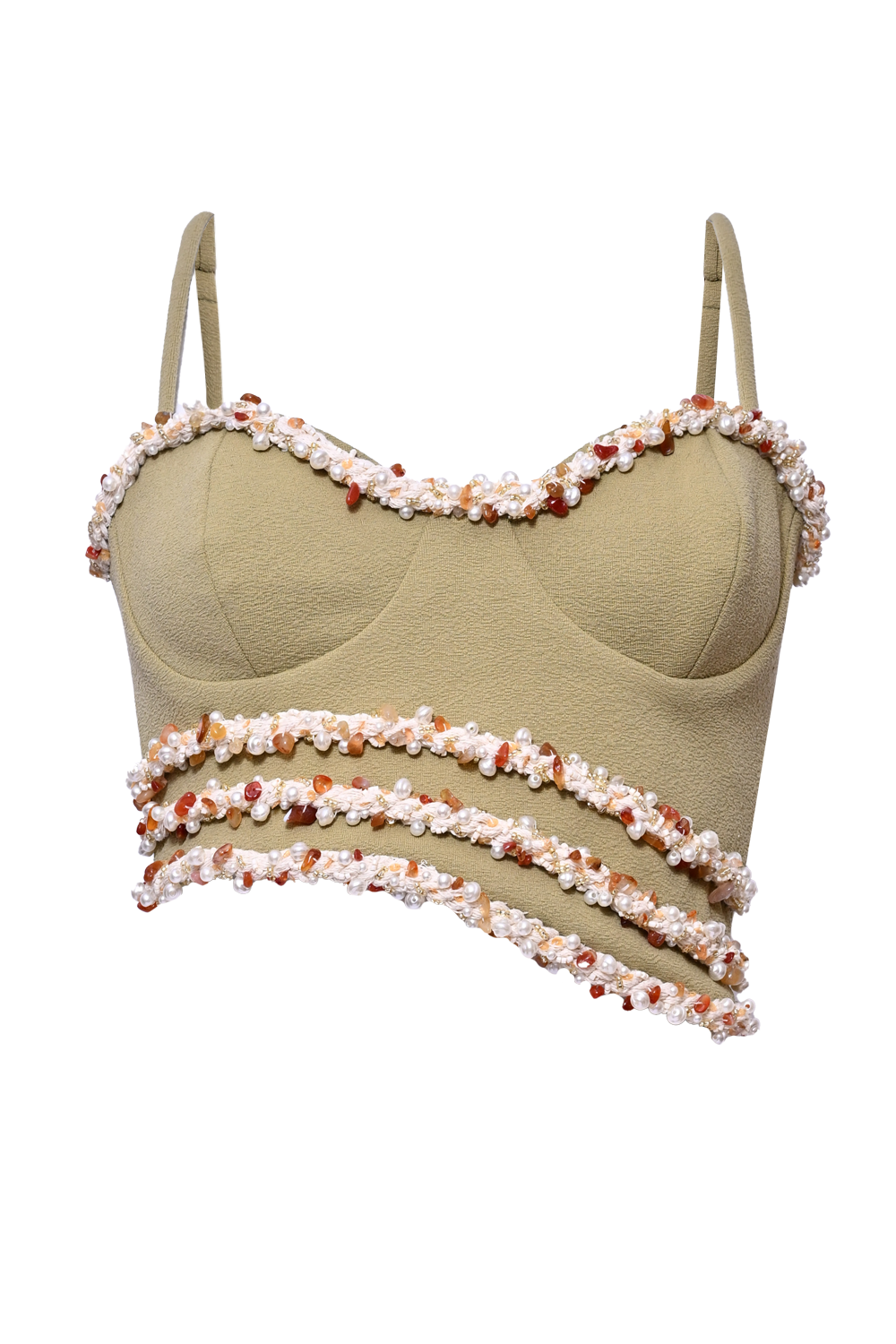 The Jade Knit Top features a structured silhouette with underwire and boning for support. Designed with an asymmetrical hem that pairs perfectly with the matching midi skirt, it showcases a rustic rope embroidery embellished with natural stones in organic wave patterns. Finished with a detachable metal zipper at the back.