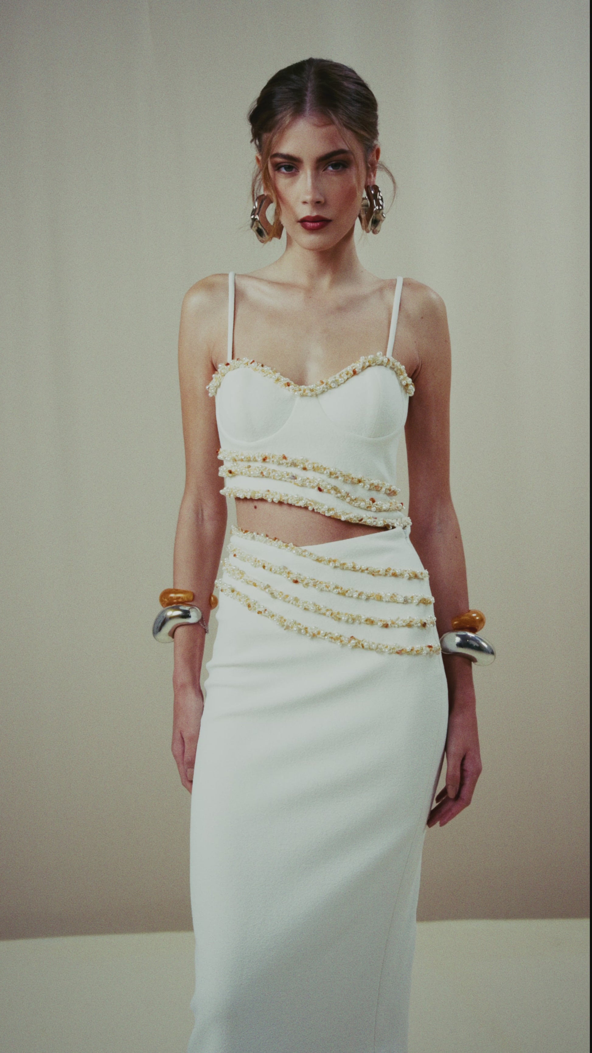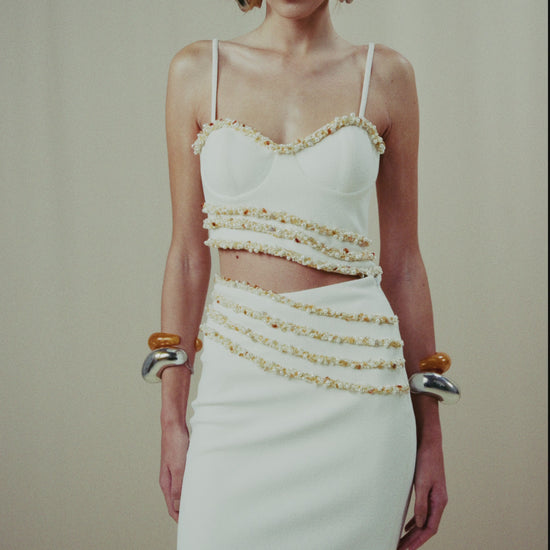 The Jade Knit Top features a structured silhouette with underwire and boning for support. Designed with an asymmetrical hem that pairs perfectly with the matching midi skirt, it showcases a rustic rope embroidery embellished with natural stones in organic wave patterns. Finished with a detachable metal zipper at the back.