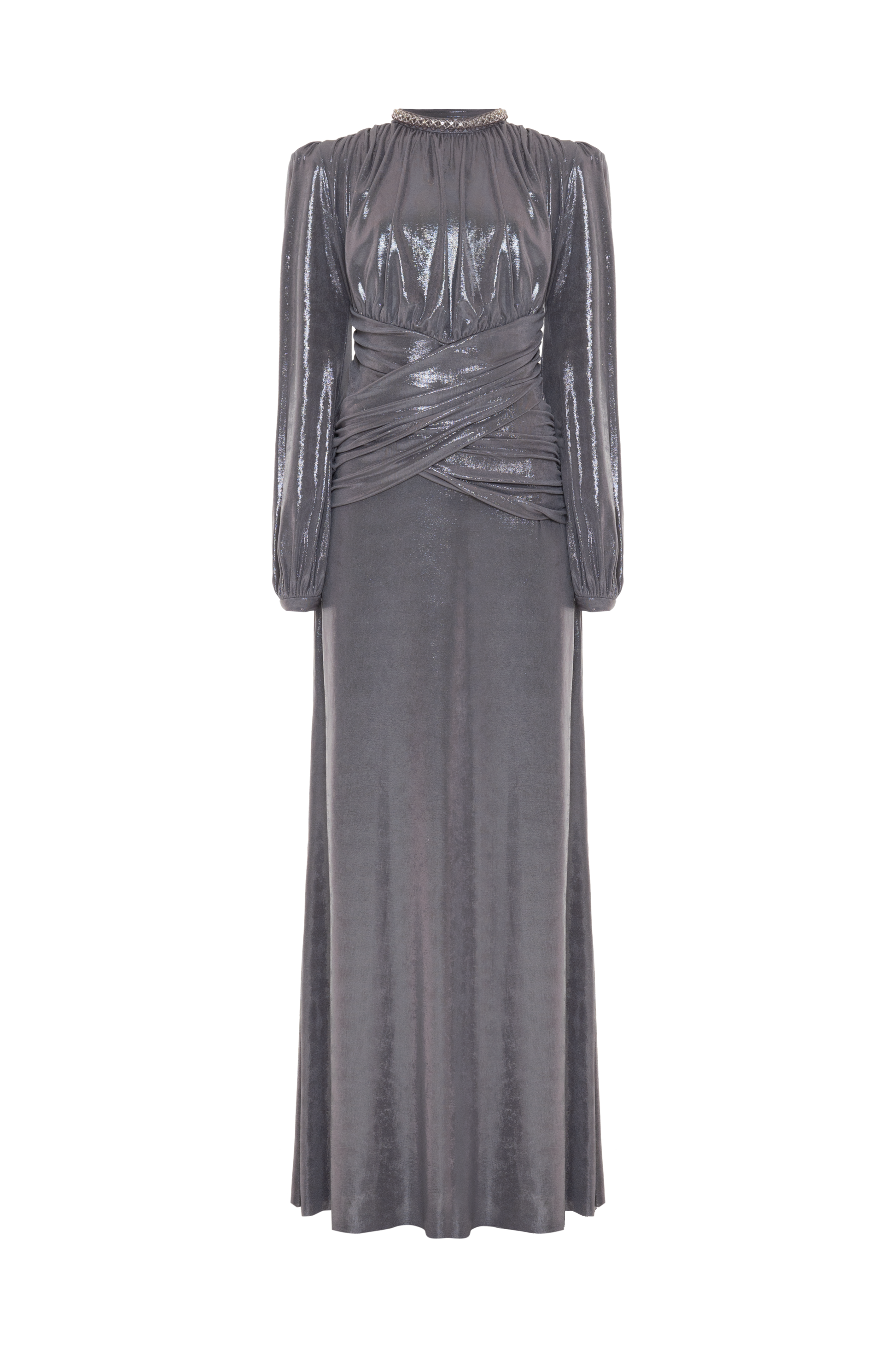 The long-sleeve Jersey Elysian long dress presents a brilliant, classic, and bold look. It features beaded embroidery at the neckline that wraps around the body like a necklace. The high neckline brings movement and texture with its blouson effect, while at the waist a crossed drape extends to the back, passing through a Patbo buckle and leaving a draped sash down to the hem. The dress also features an open back, long puffed sleeves with shoulder pads and cuff buttons, and button and loop closure at the back.