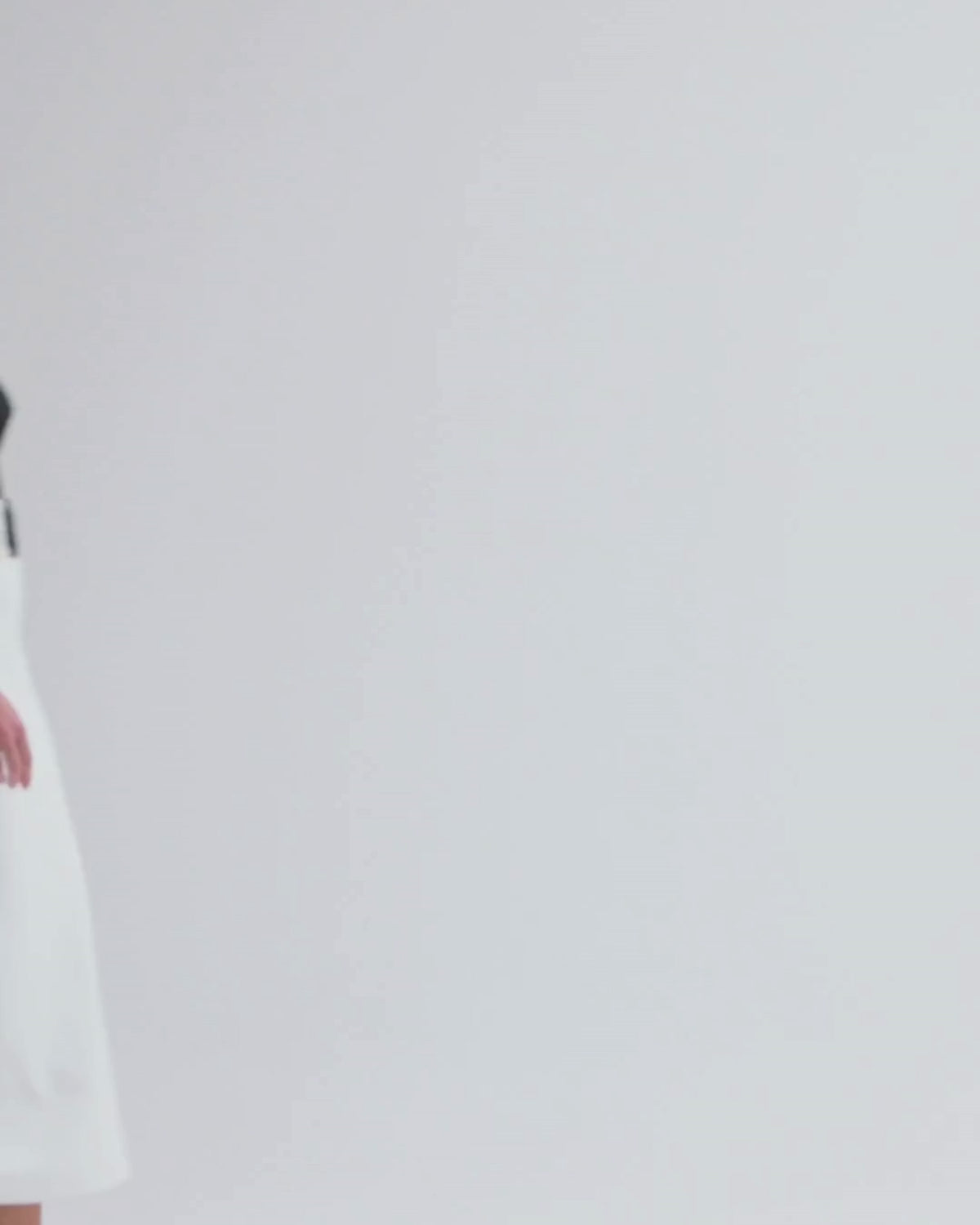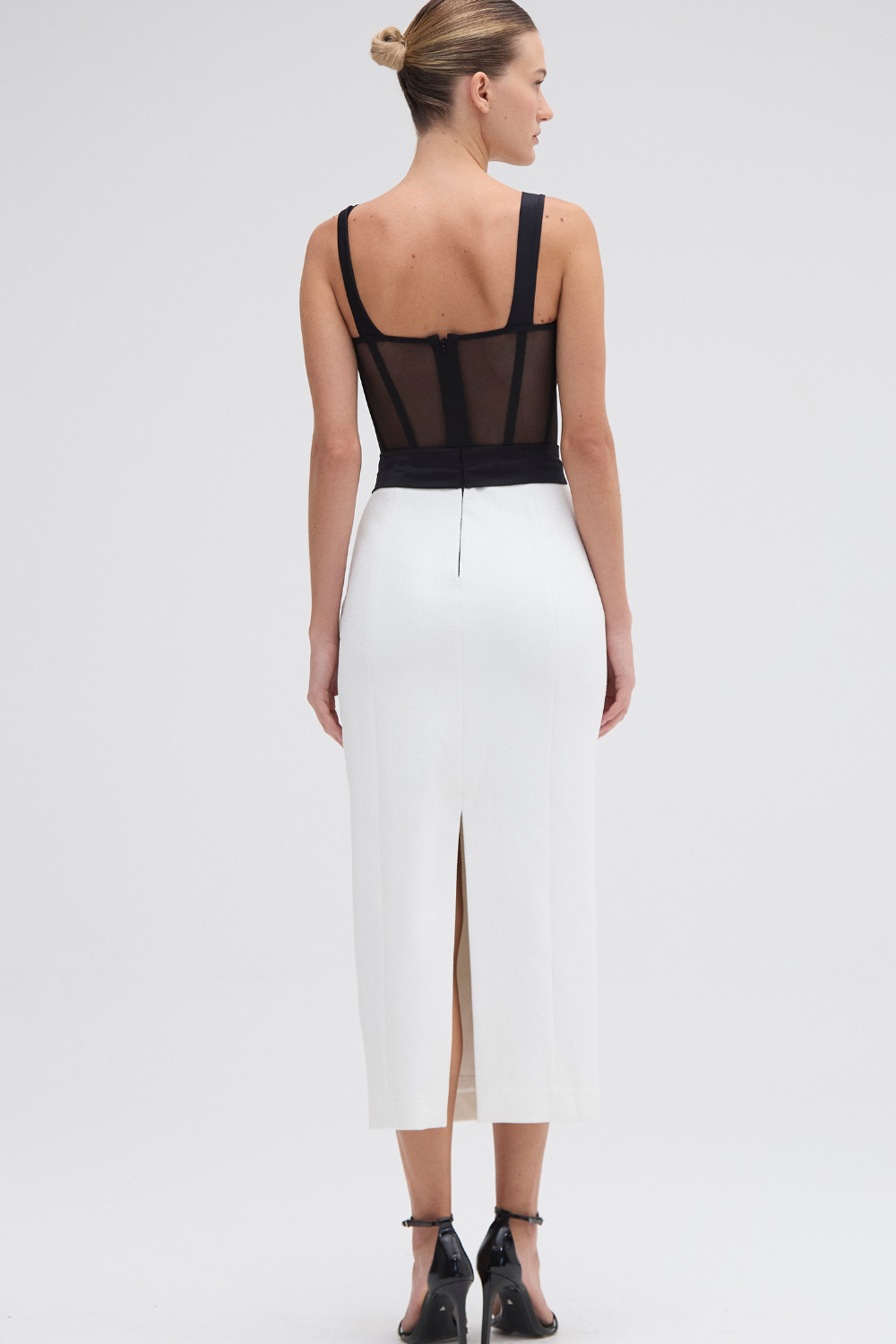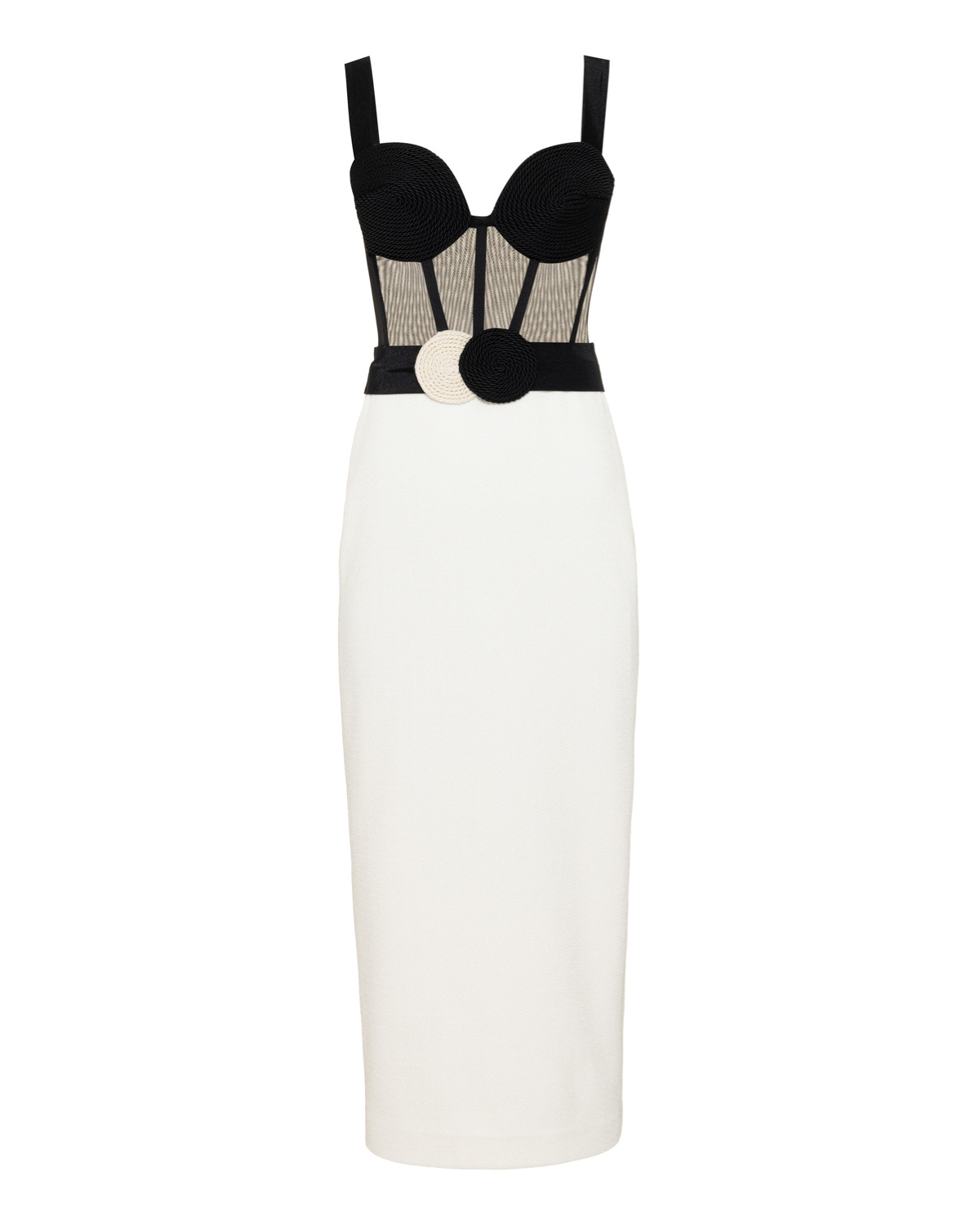 This midi dress features a sweetheart neckline with woven detailing into a structured tulle corset bodice with a fitted belt detailing and two tone white textured knit fitted skirt. Concealed back zipper closure.