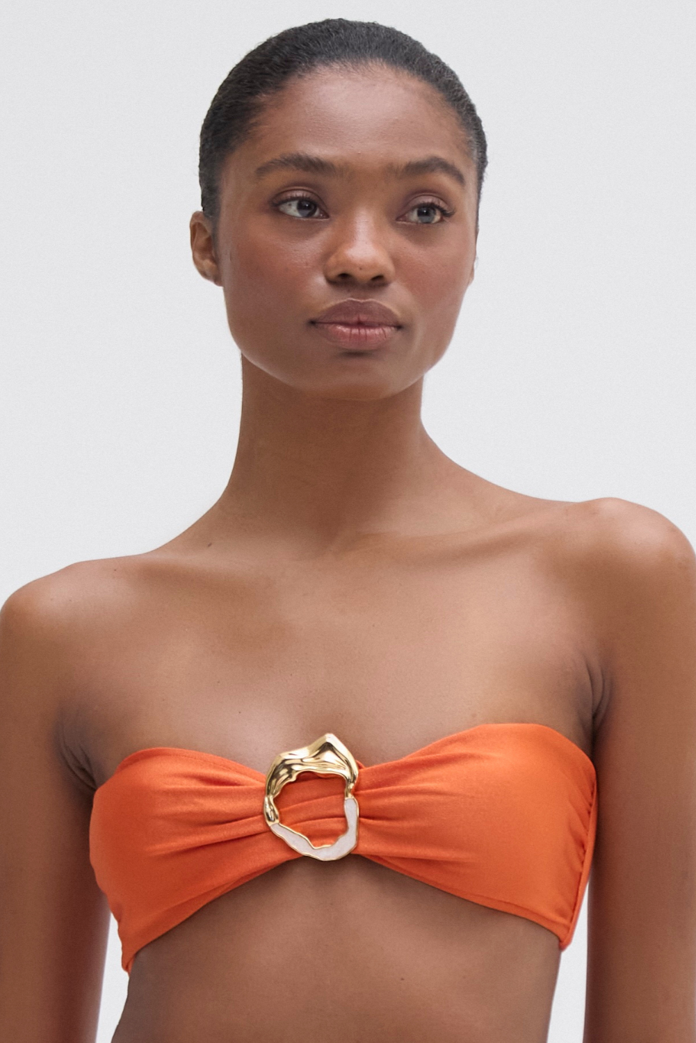 This bandeau bikini top in a stretch lycra fabric features a center ring detail with an optional halter neck strap. Back clasp closure.