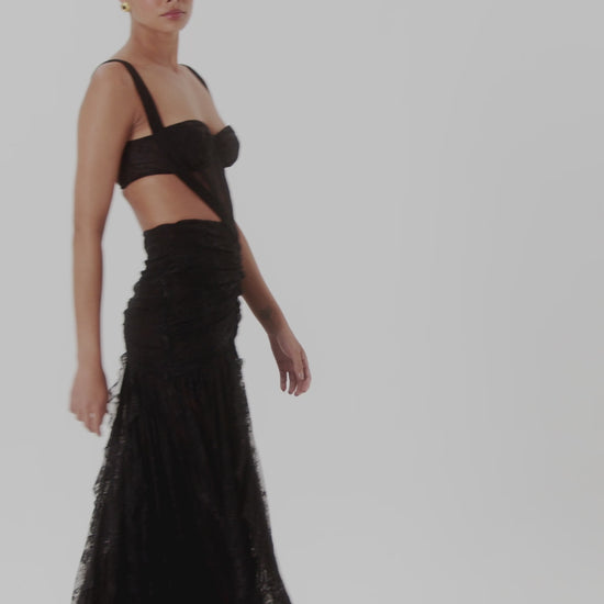 A bold reinterpretation of classic lace eveningwear, the Laila Lace Cut-Out Gown features a structured corset-style bodice with wide straps and a daring side cut-out that highlights the waist. Its sheer lace construction contrasts with artfully ruched panels for added texture and movement, while the floor-length skirt offers fluid elegance. Finished with a back zipper closure for a seamless fit.