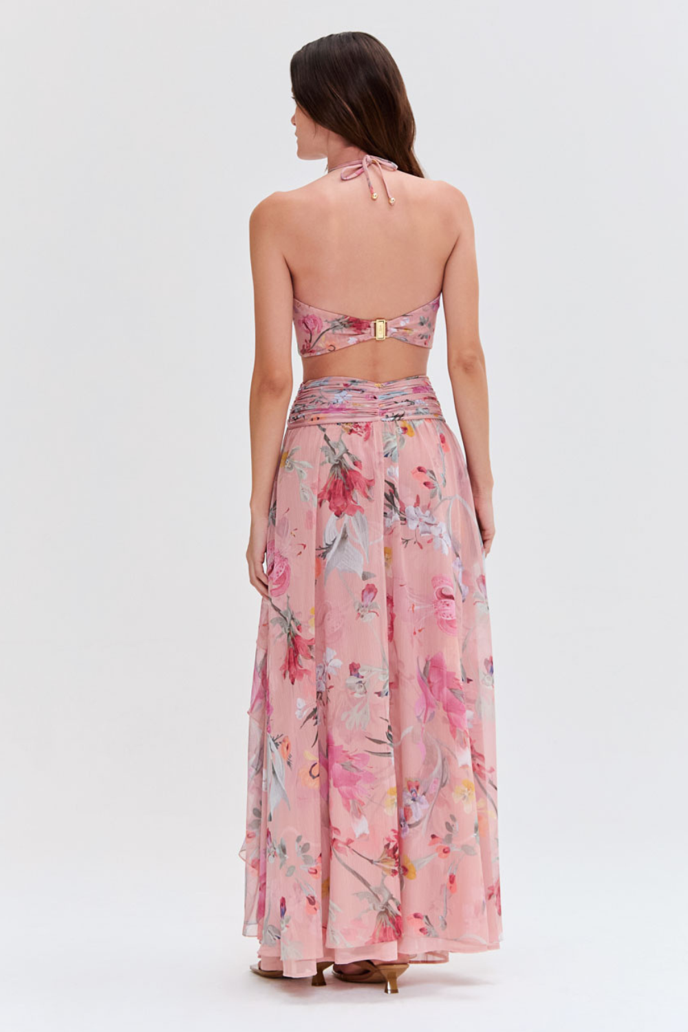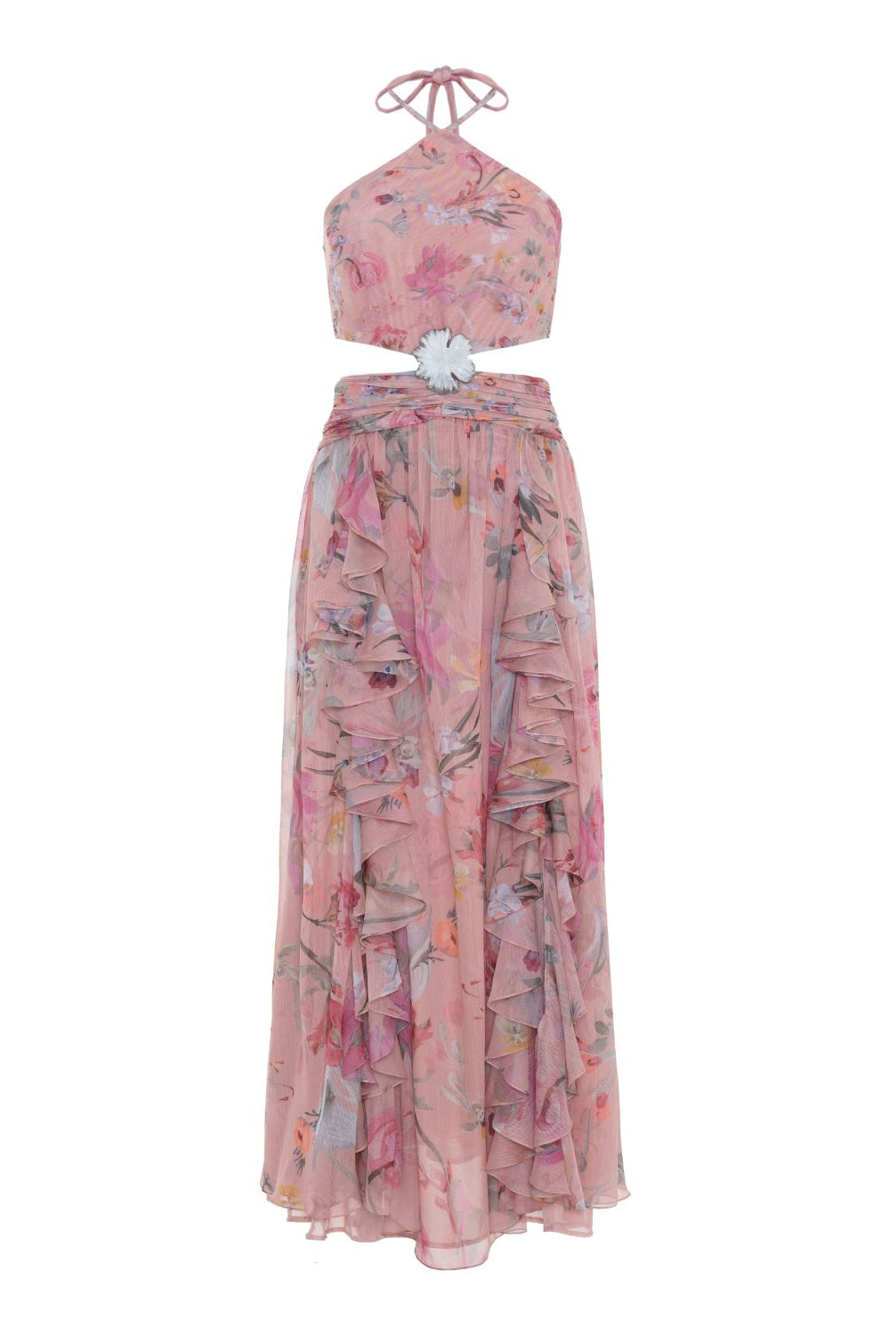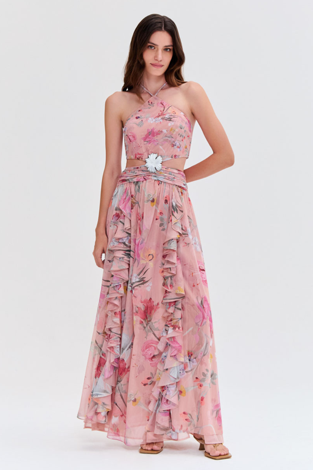This maxi dress features a halterneck design with flattering side cut outs creating an open back detail, a special hardware feature, ruching detail along the waistline and flowy skirt with ruffled fabric throughout. Tie closure at neck and back clasp.