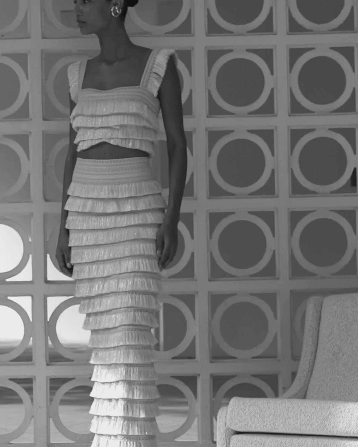 This maxi skirt features a crocheted metallic trims that are hand-sewn together. Skirt is made from layers of metallic silver fringe that sway when you move. Fully lined. Runs true to size. Model is wearing a size 4.