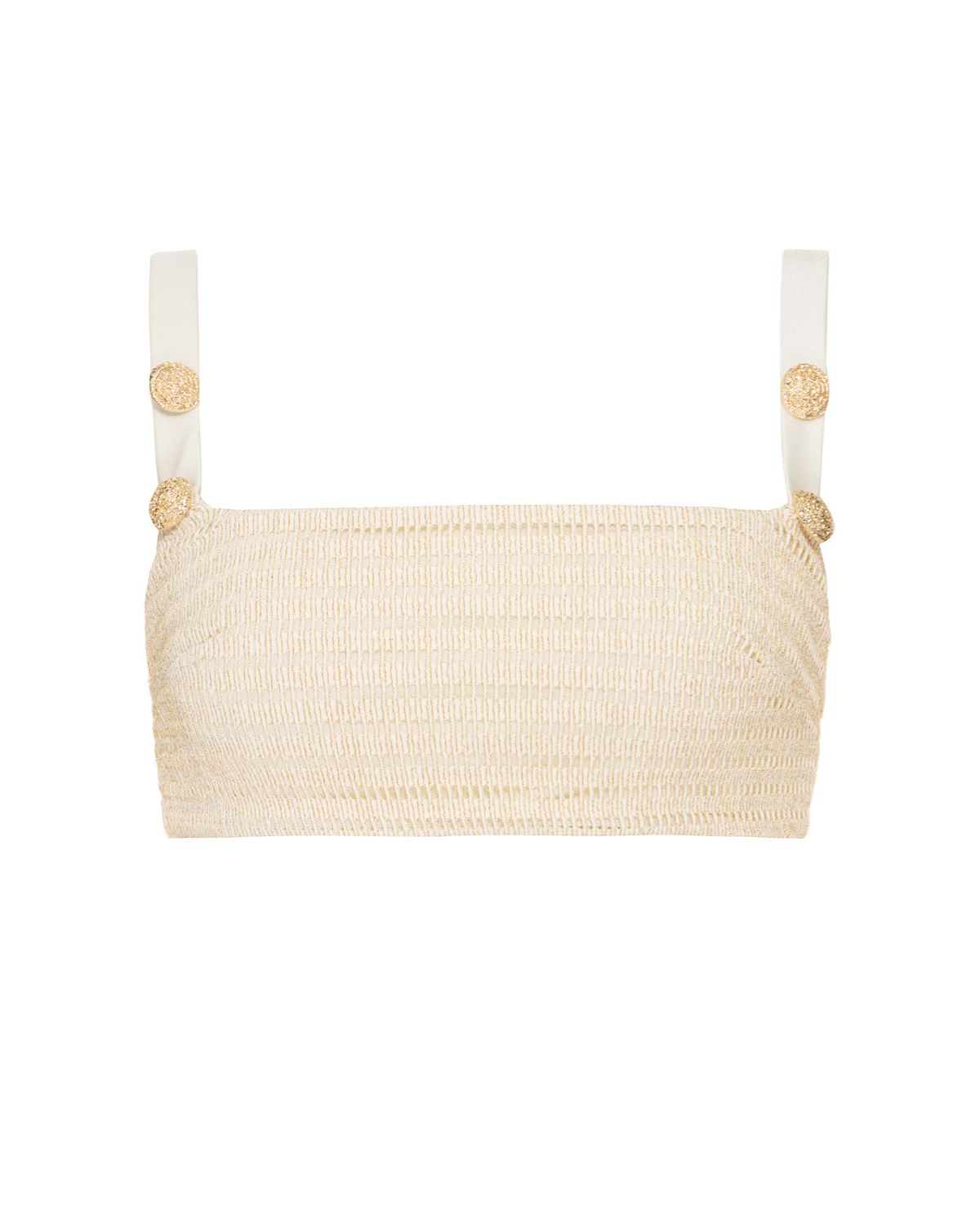This knit bikini top features a square neckline and bandeau-type fit with button detail along the medium-thick straps. Back clasp closure.