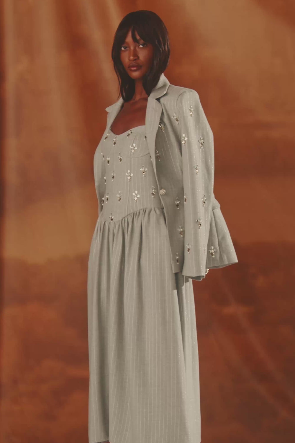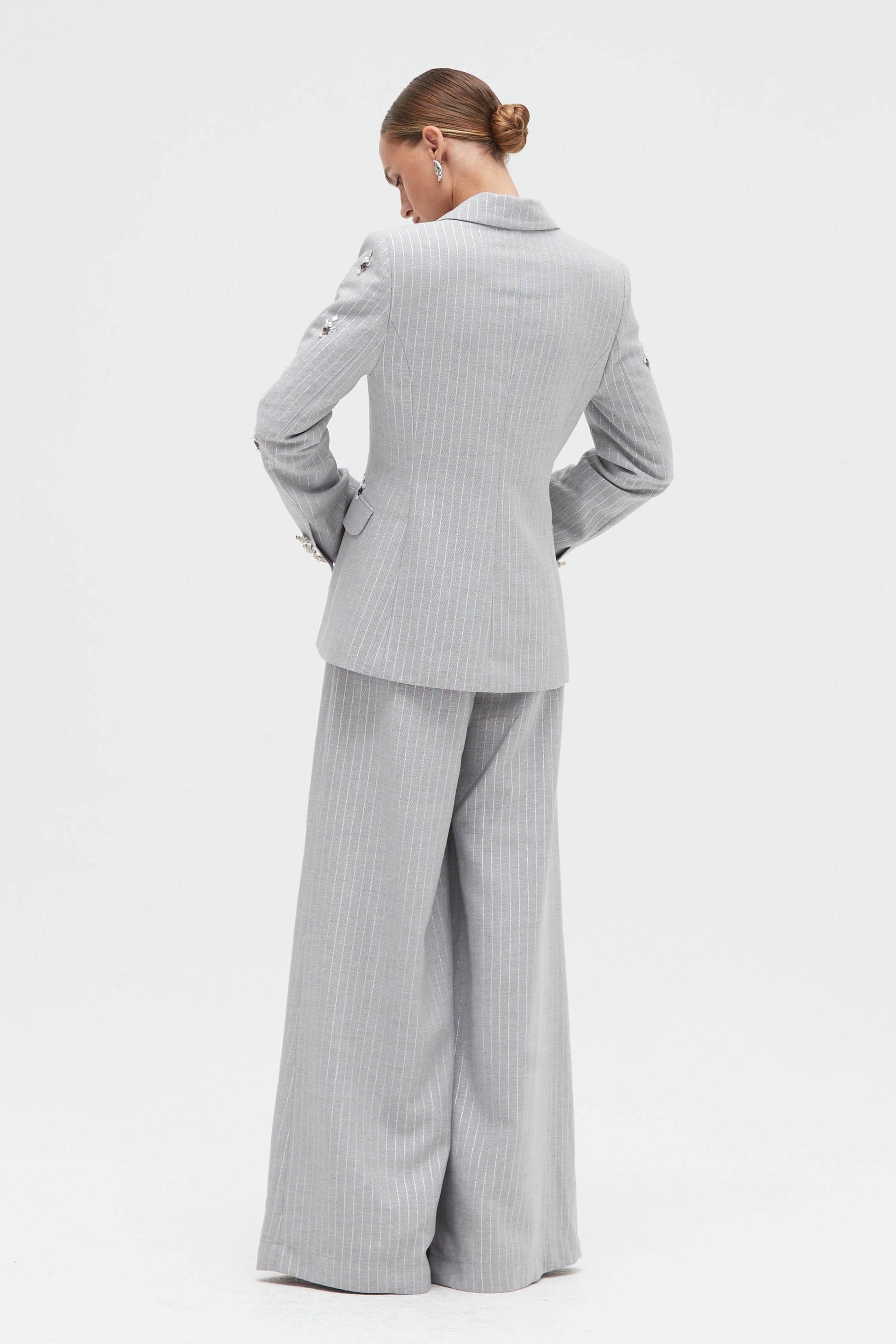 Gray pinstriped blazer with exclusive hand embroidery. It combines structure and sophistication with a subtle touch of shine. Crystals and sequins are hand-applied to create a jewel-like effect, elevating the piece from workwear to evening-ready. Features a slightly cinched waist, flap pockets, and a front closure with a decorative button.