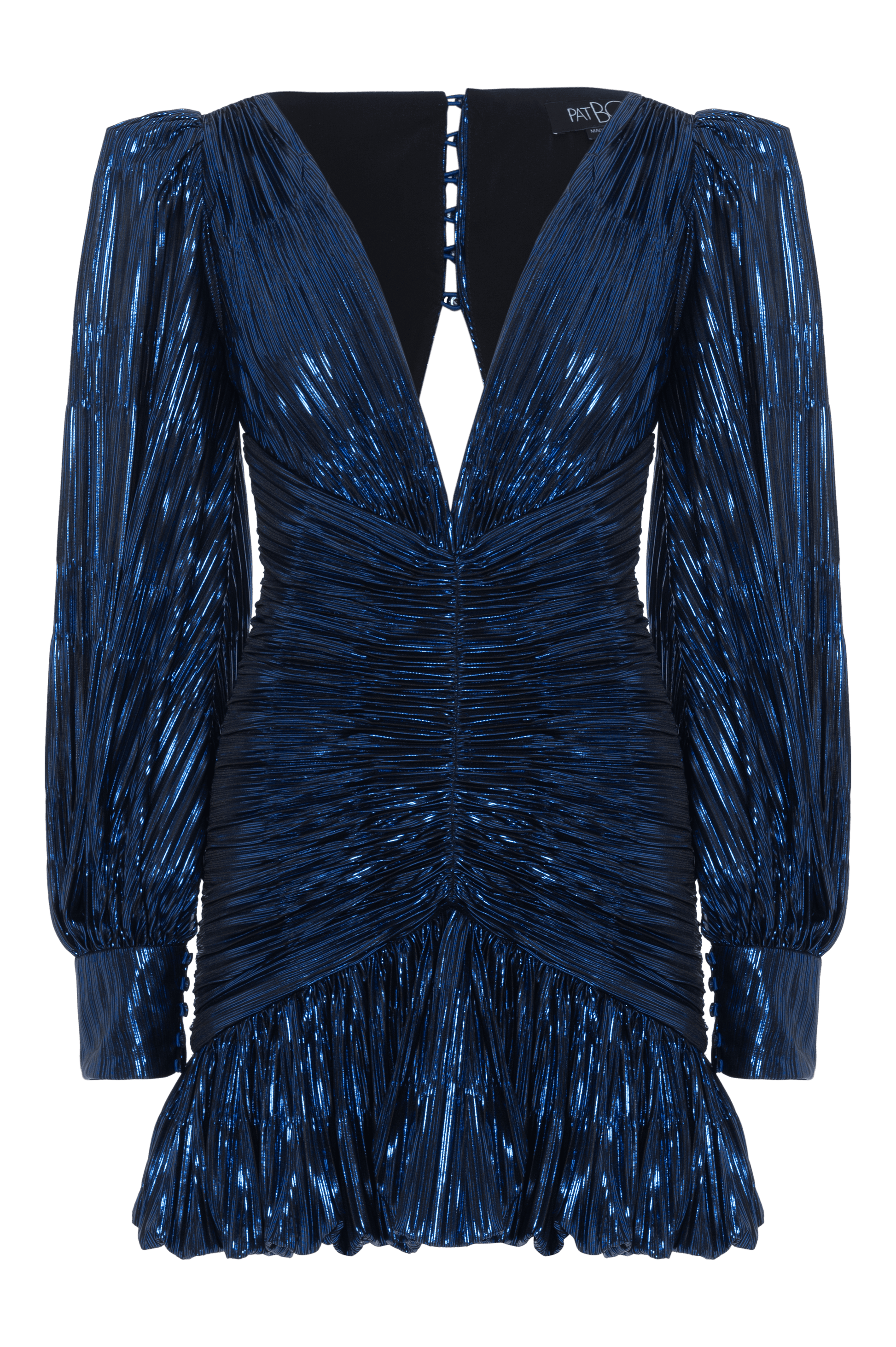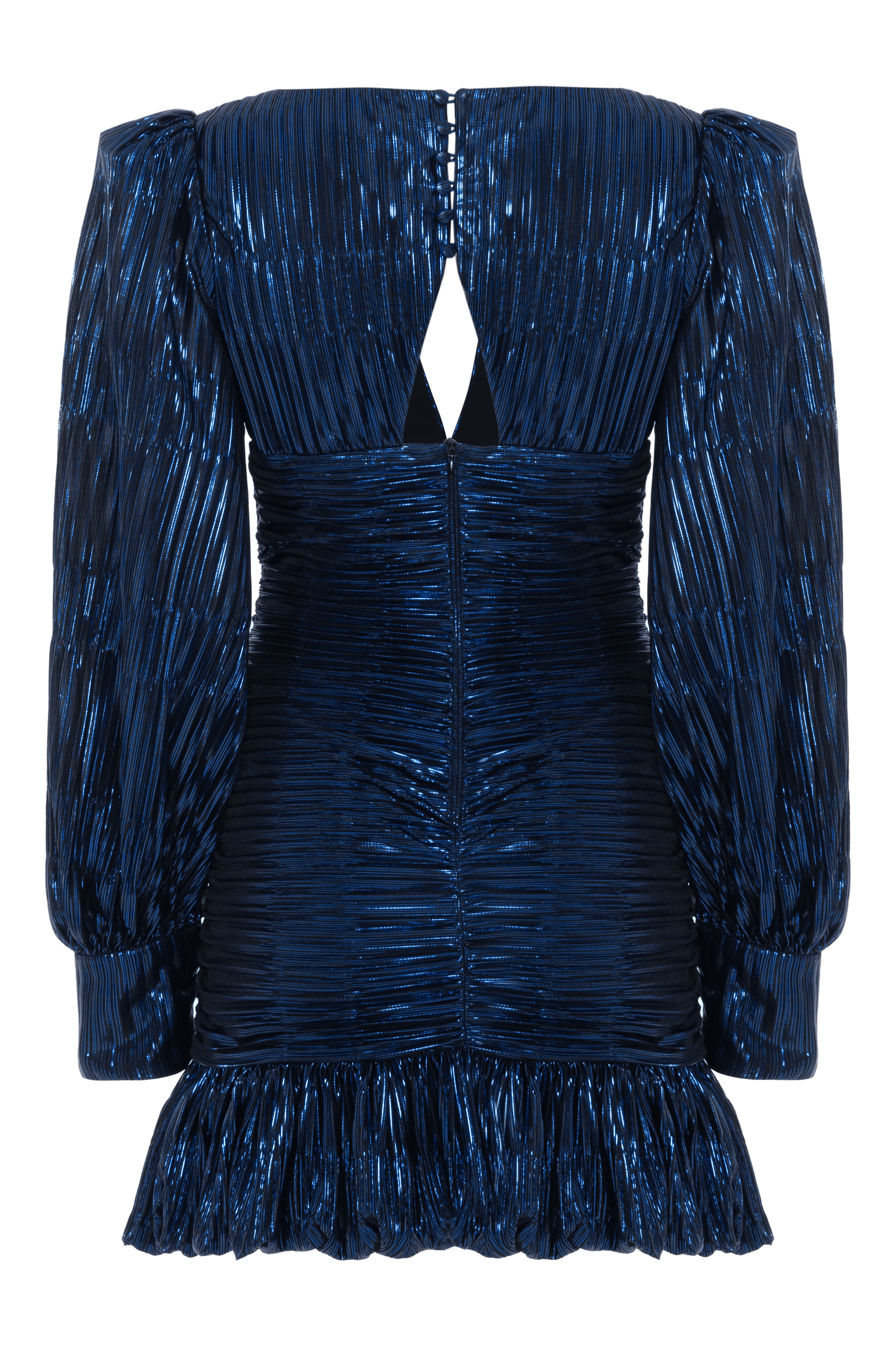 Crafted in a luminous blue pleated fabric, it features a deep V-neckline and bold shoulders that create an empowered silhouette. The ruched detailing through the bodice enhances the shape, while the flounced hem adds a playful, flirty finish. Long sleeves with buttoned cuffs and a small back cutout complete the look with elegance. Perfect for festive nights and special events