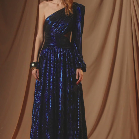 A striking evening statement, this navy blue gown is crafted from metallic plissé fabric that catches the light with every move. Designed with a one-shoulder neckline and a fluid long sleeve gathered at the cuff, it exudes modern elegance. A waist cut-out adds a bold touch, while the flowing maxi skirt features a high slit for effortless movement and a hint of allure.