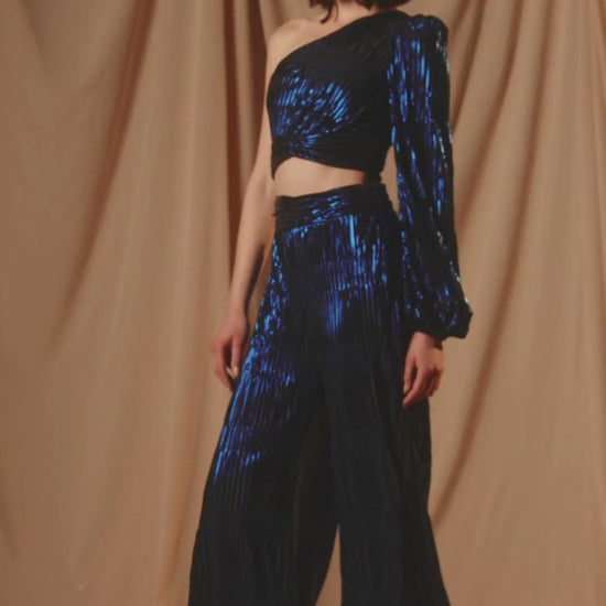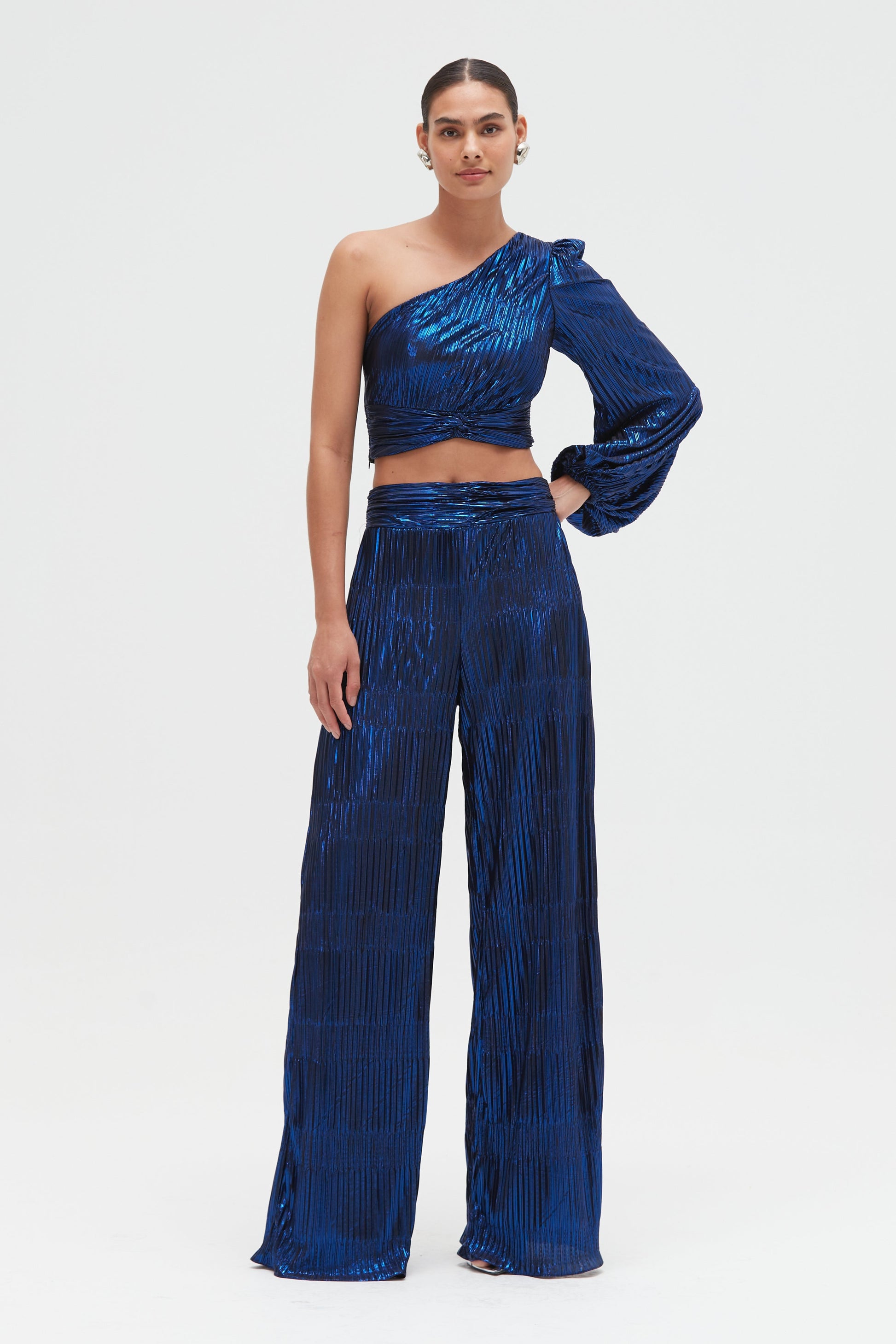 Made from a nvy blue luminous metallic plissé, these pants are designed to flatter with a high-rise silhouette and fluid wide legs. Cinching at the waist, it brings definition and polish to the look. Effortlessly chic whether styled with the coordinating top or on its own.