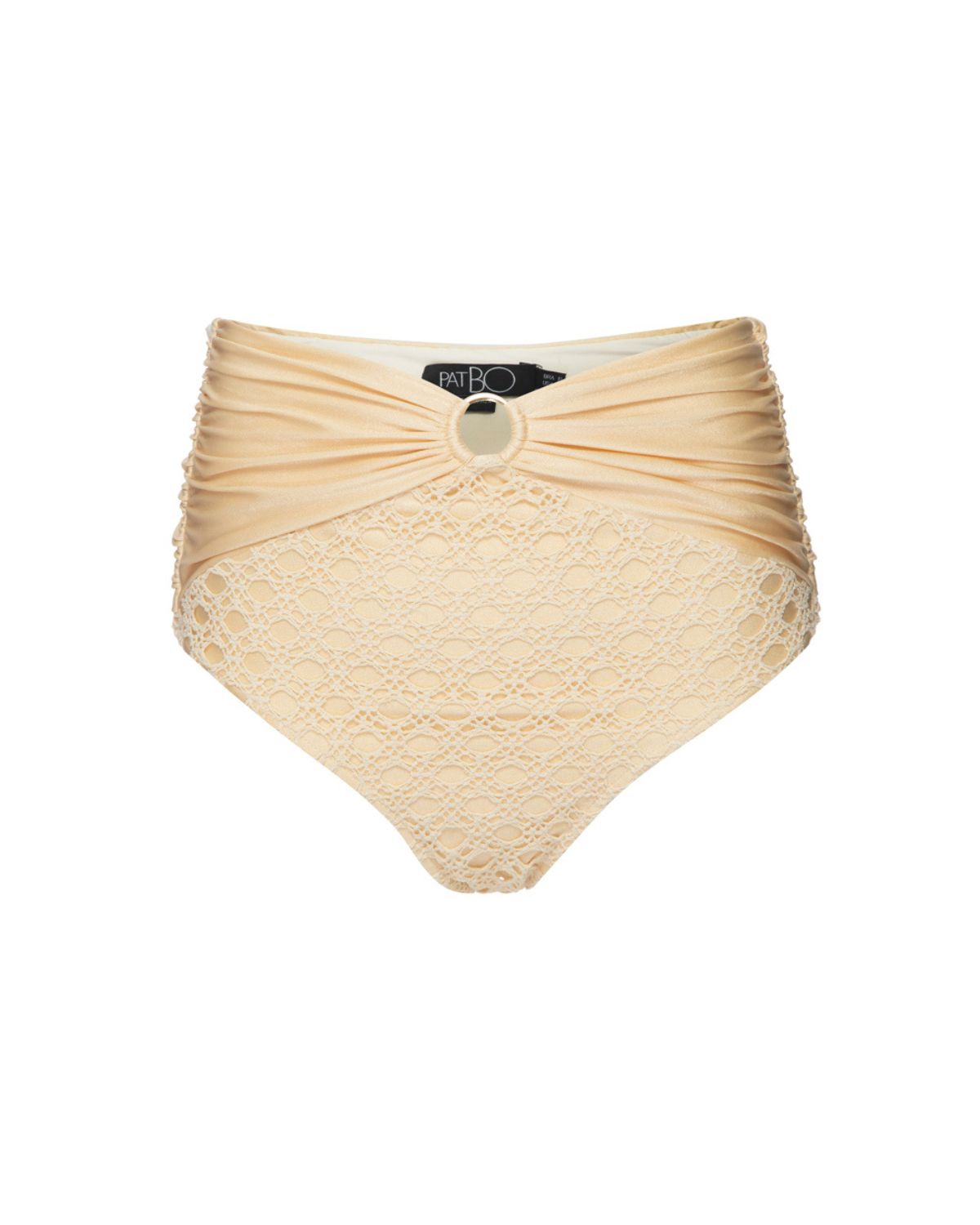 Classic high waist bikini bottom with center ring. Medium to full coverage. Fully lined. Runs true to size. Model is wearing a size small.