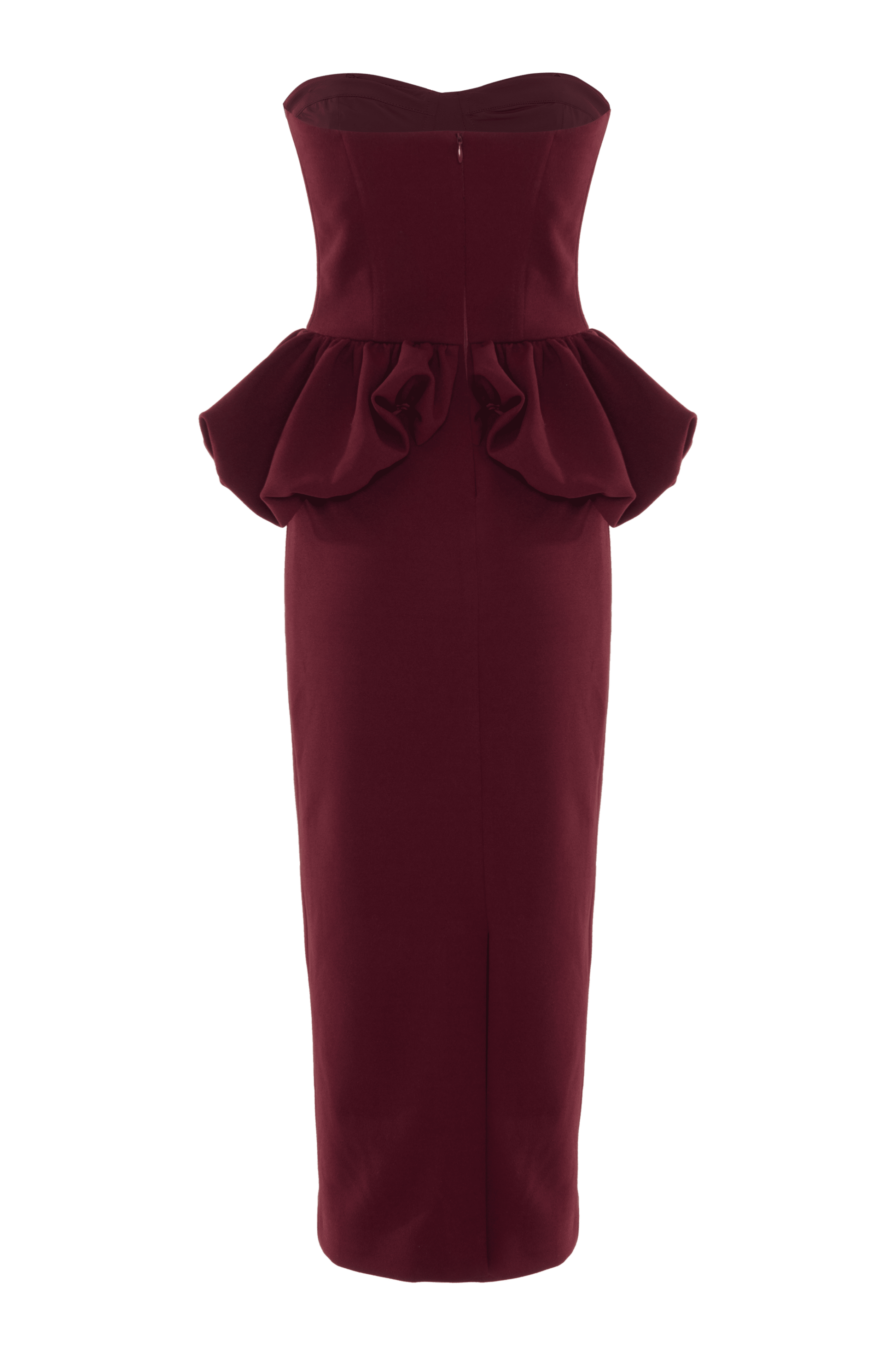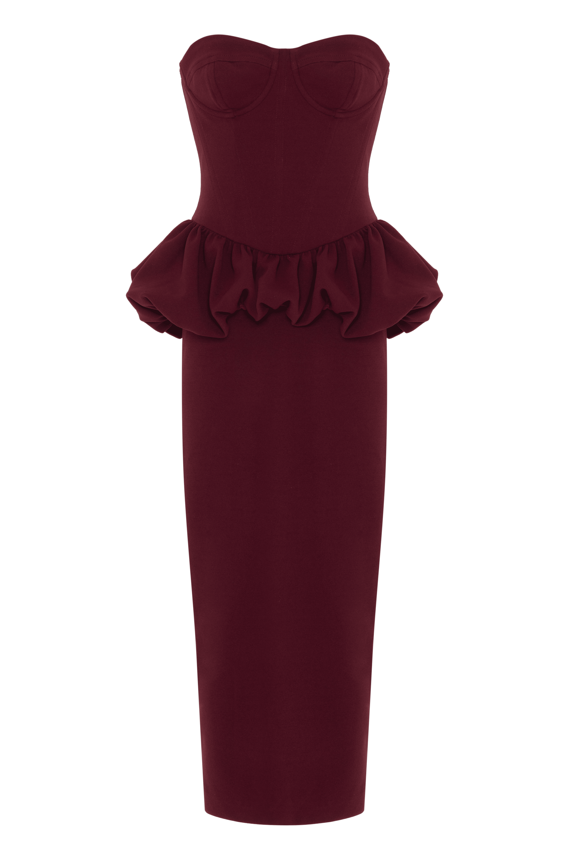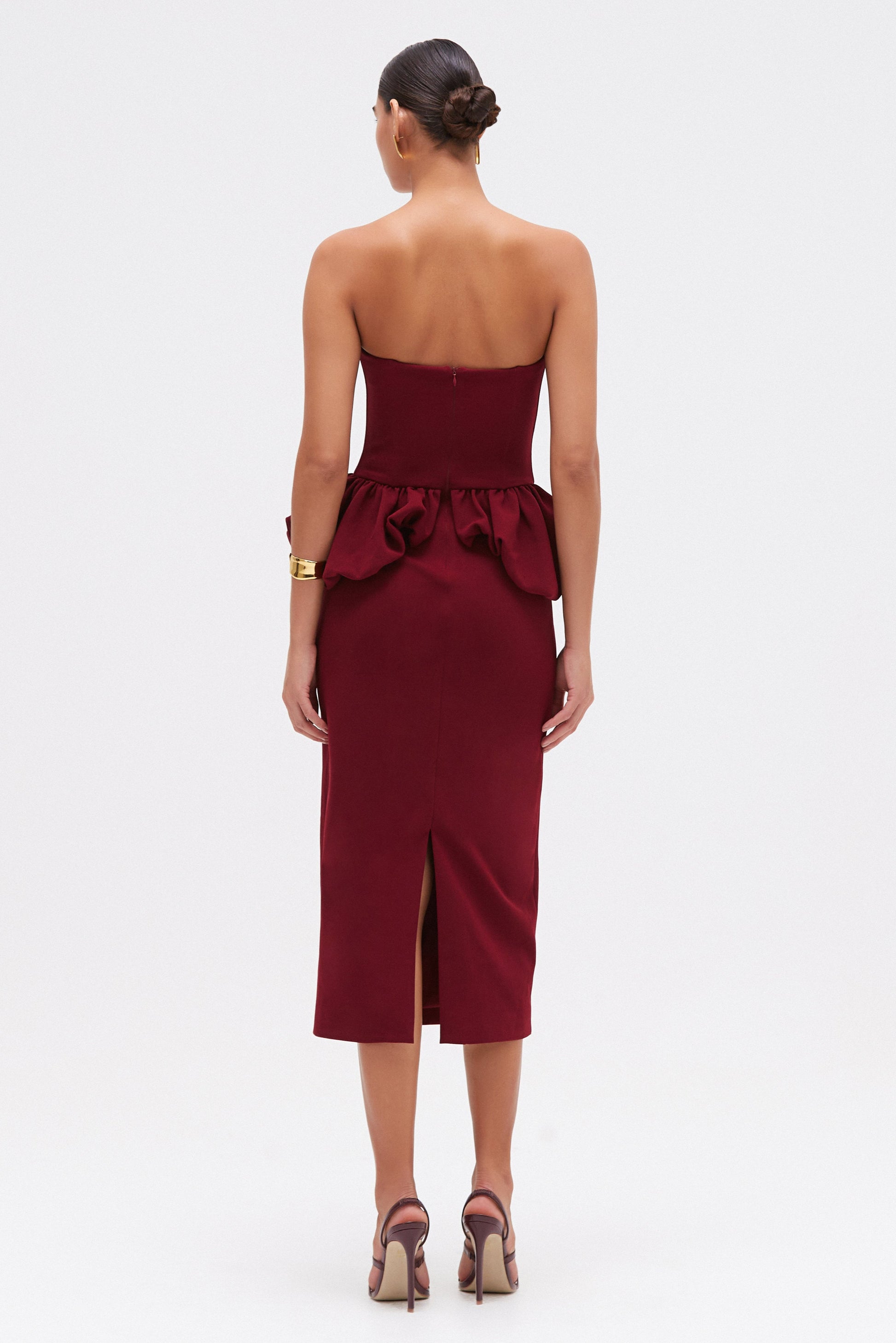 Sculptural and striking, the Mystique Crepe Midi Dress is tailored from structured crepe for a sleek, body-contouring fit. This strapless silhouette features a corset-style bodice with defined cups and an architectural peplum that adds volume and edge to the waistline. Finished with a back slit for ease of movement and a concealed zipper closure.