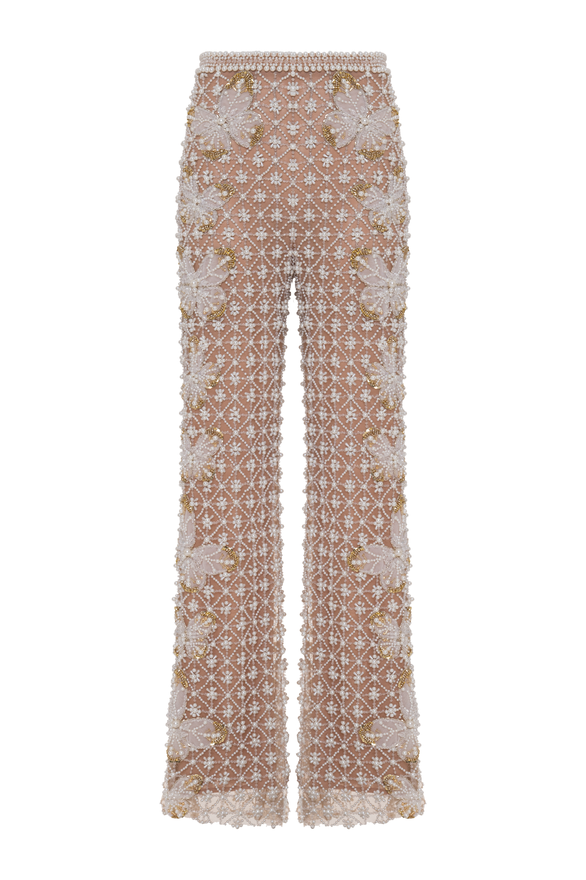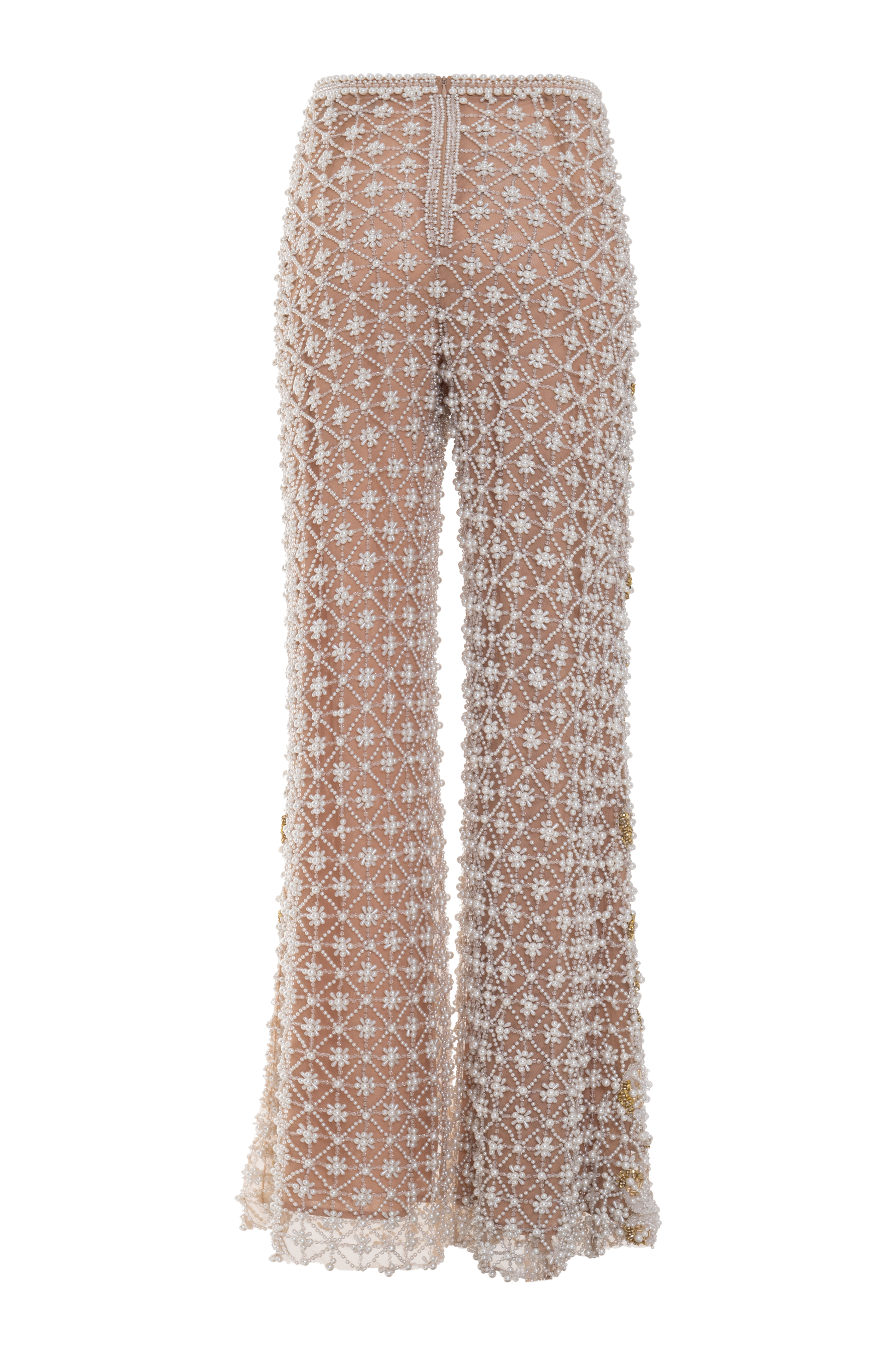Flared tulle pants with pearl and crystal embroidery and butterfly appliqués. Features full lining, slim waistband, and invisible back zipper.